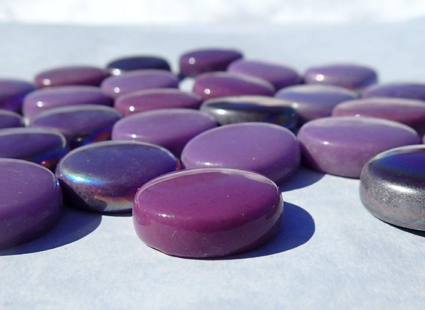 These glass drops are like a summer harvest of your favorite berries. This is a mix of light and dark purples; some of them have an iridescent finish, others do not. They are large drops at 20mm (3/4") in diameter and are 5mm (1/5") thick. Unlike traditional glass gems, these are uniform circles with a domed top and straight sides.