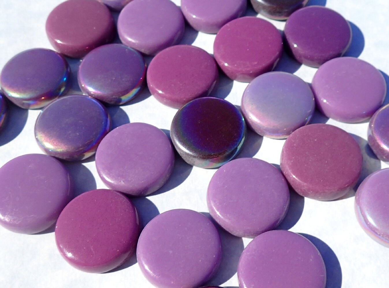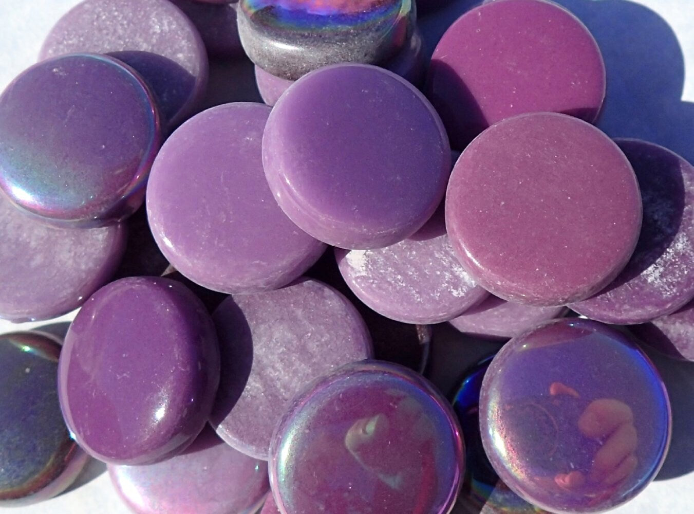 These make colorful embellishments to your mosaic or other crafting projects. Use the iridescent alone, or mix them with the glossy to add interest to your project!