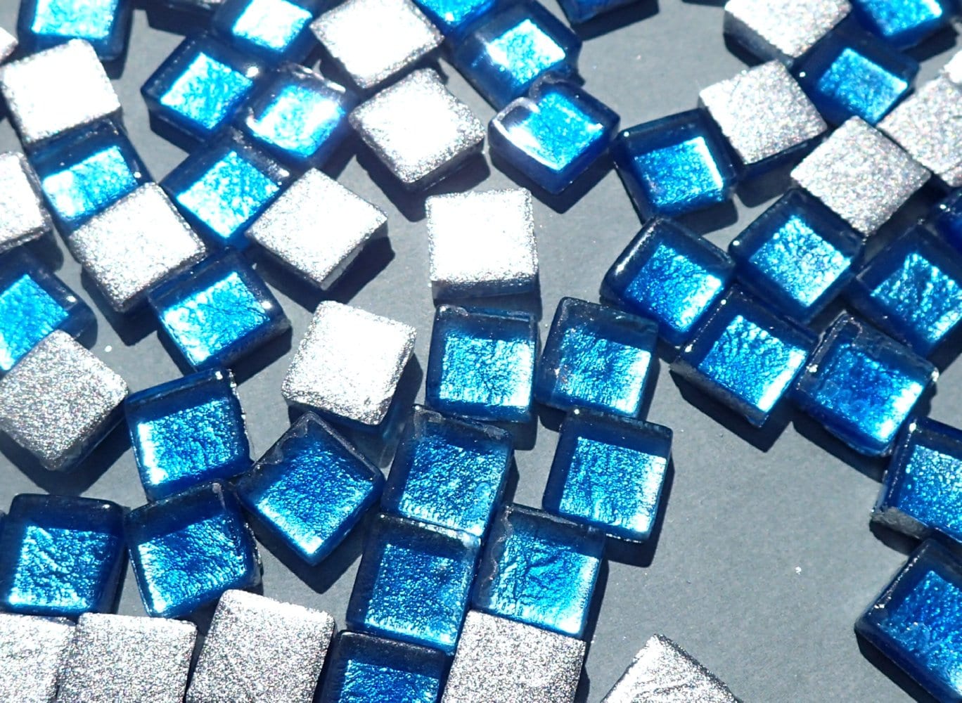 Blue Foil Square Crystal Tiles - 10mm - 50g Metallic Glass Tiles in Dark Aqua - Approx 50 Tiles
