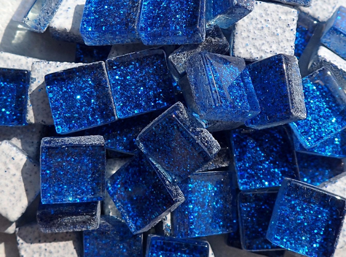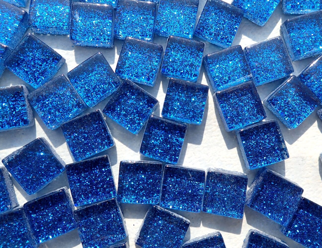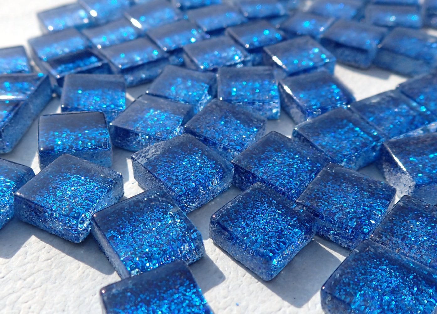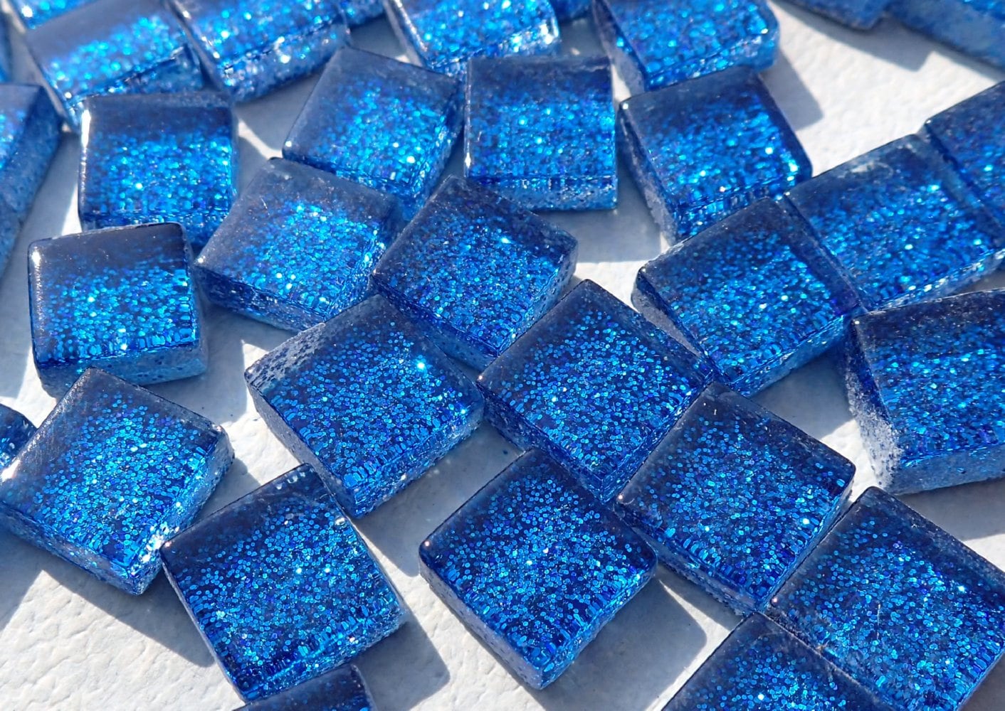 This is a set of 100 mini glass 1cm (3/8") tiles that have a glitter backing. Because it is a backing, these tiles have depth to them. The glitter is a medium blue color. It's not as bright as a royal blue.