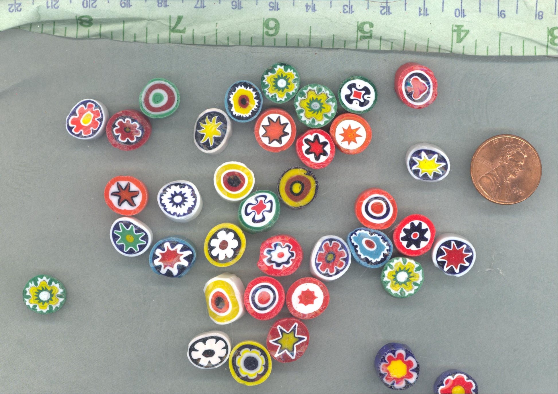 This is 25 grams of millefiori. These are a mix of chunky, opaque, brightly colored millefiori. They range in size from approximately 11-13mm in diameter and 4.5mm thick.