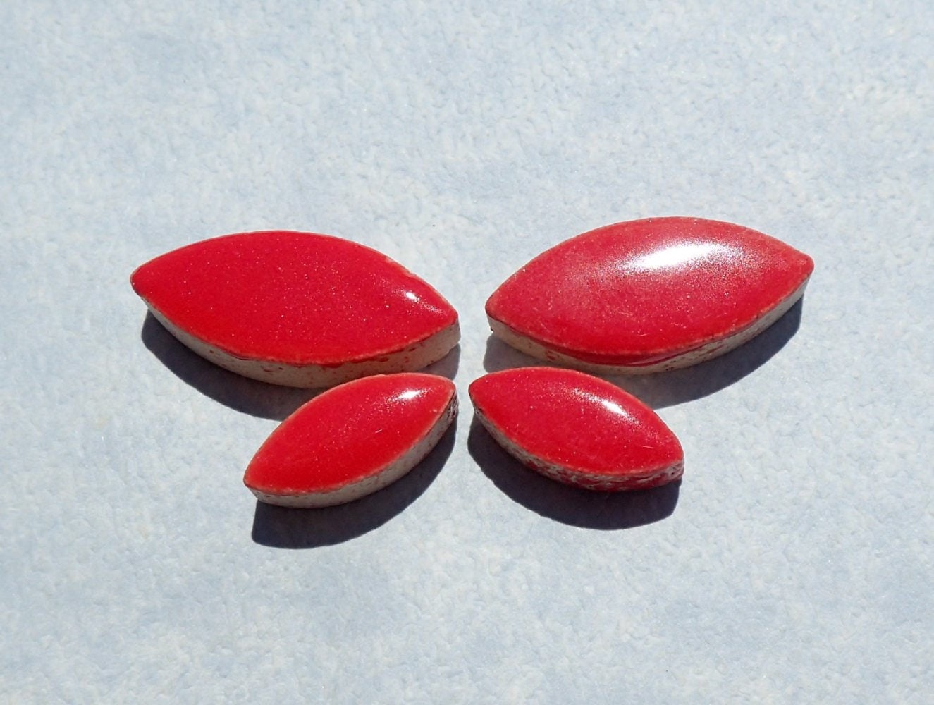 These petal tiles come in a mix of 2 different sizes: 1/2" long and 1/4" wide (13mm x 6mm) for the smaller petal, 3/4" long and 3/8" wide (20mm x 9.5mm) for the larger petal. Each petal is 1/5" (5mm) thick. While petals are obviously perfect for flowers, they also work for leaves and wings, along with other natural shapes. These are a bright poppy red color.