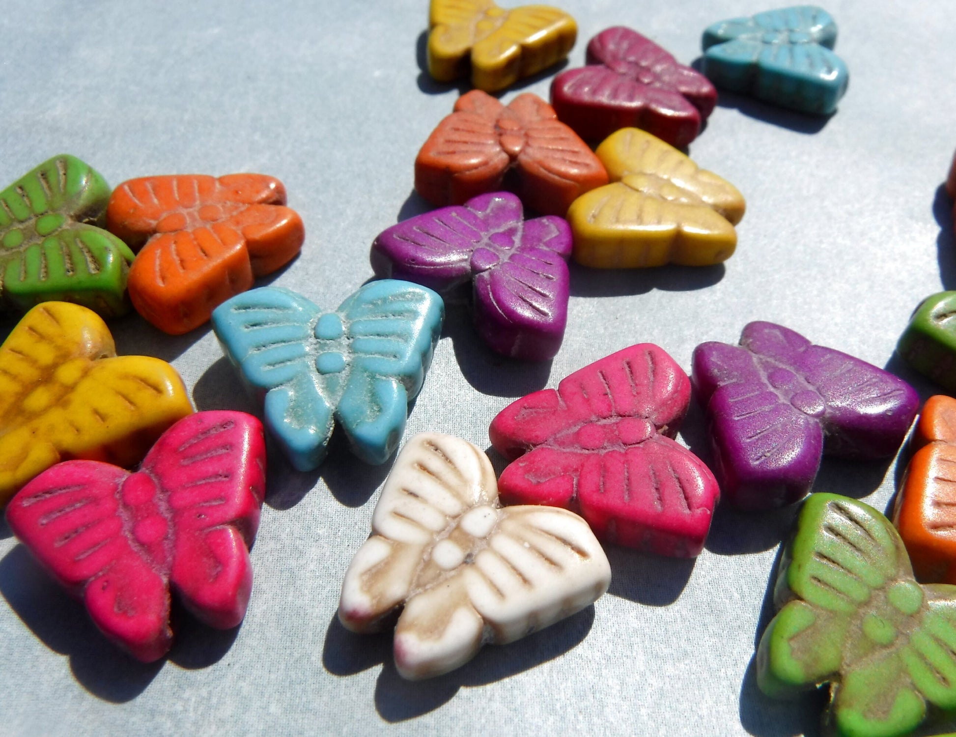 These butterfly stone beads are brightly colored with carved details. They are 12mm x 15mm, They are approximately 4mm thick.