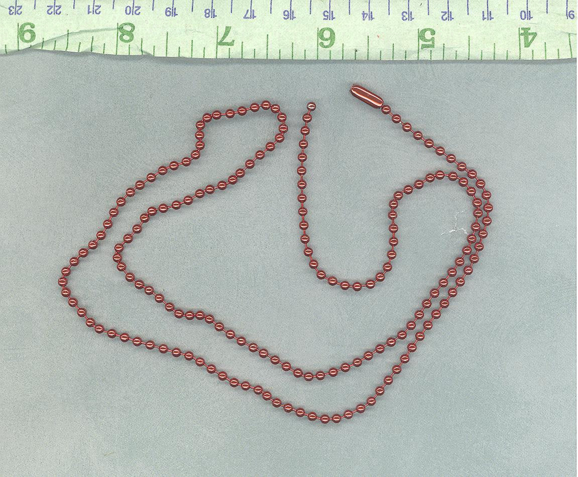 These are 10 copper colored ball chains that are 24" in length. They are 2.4mm in diameter. Ball chains are versatile because you can use household scissors to cut them down to the desired length. Each chain includes the connector.