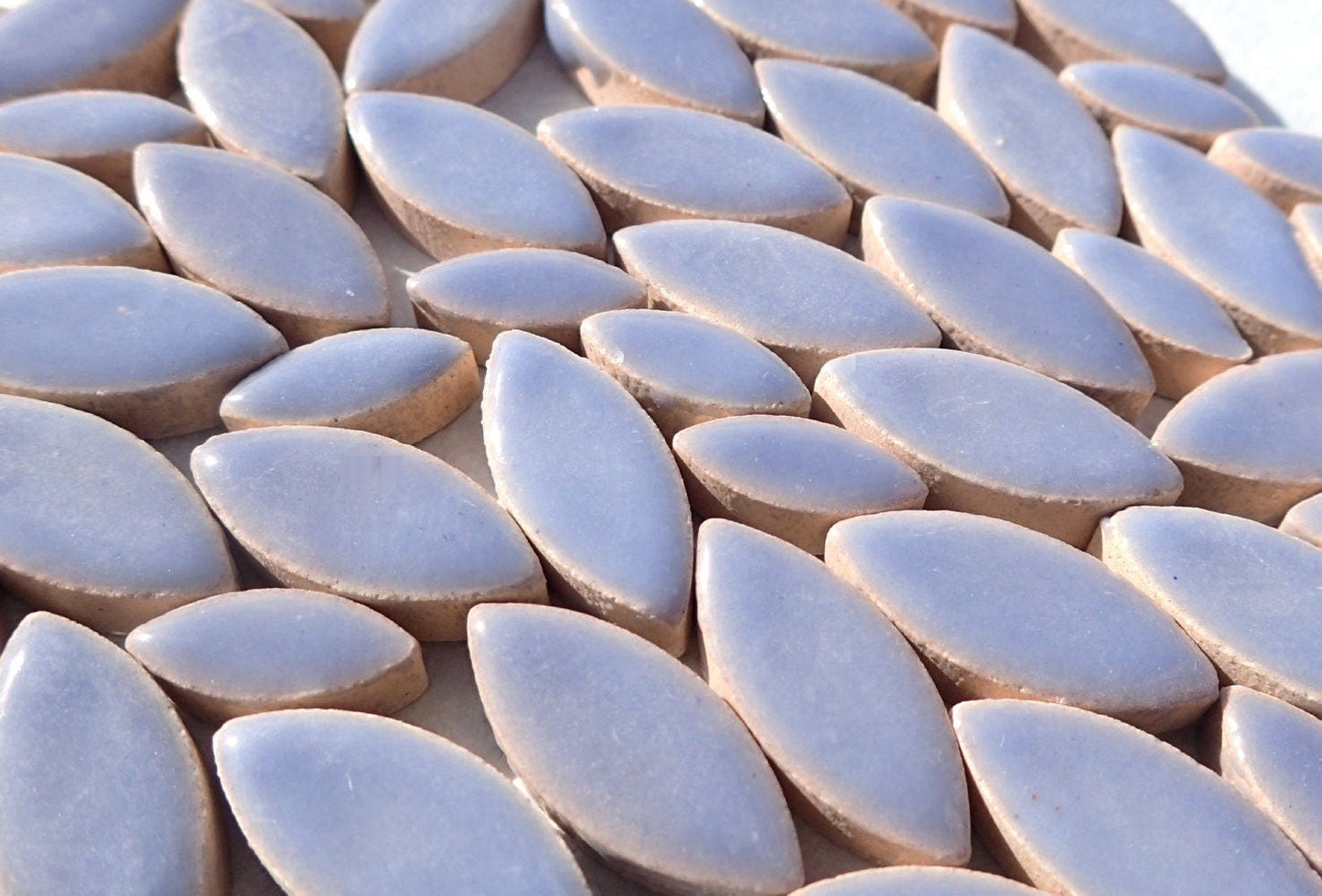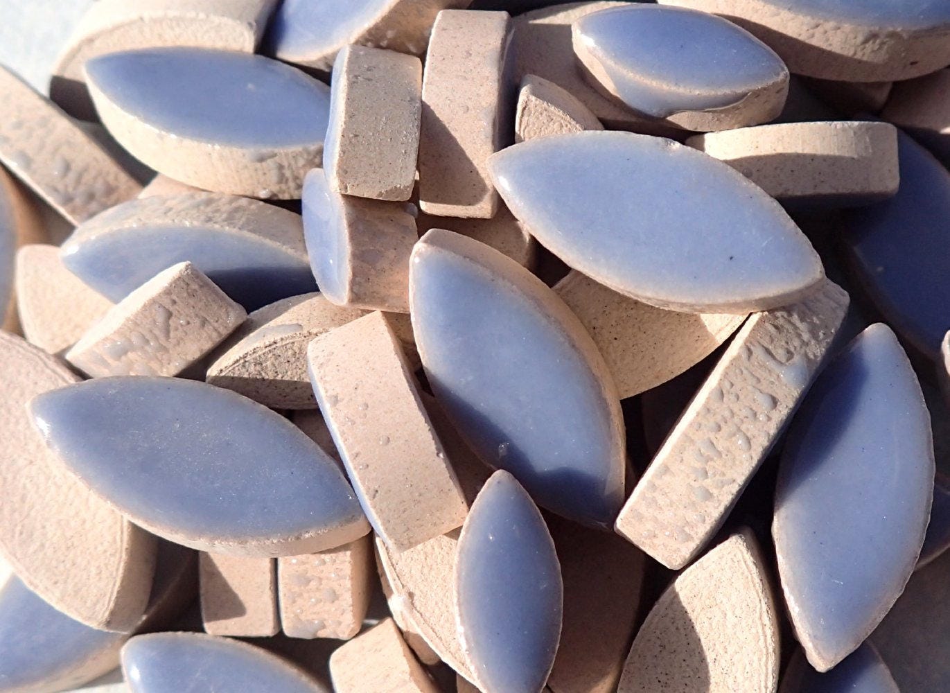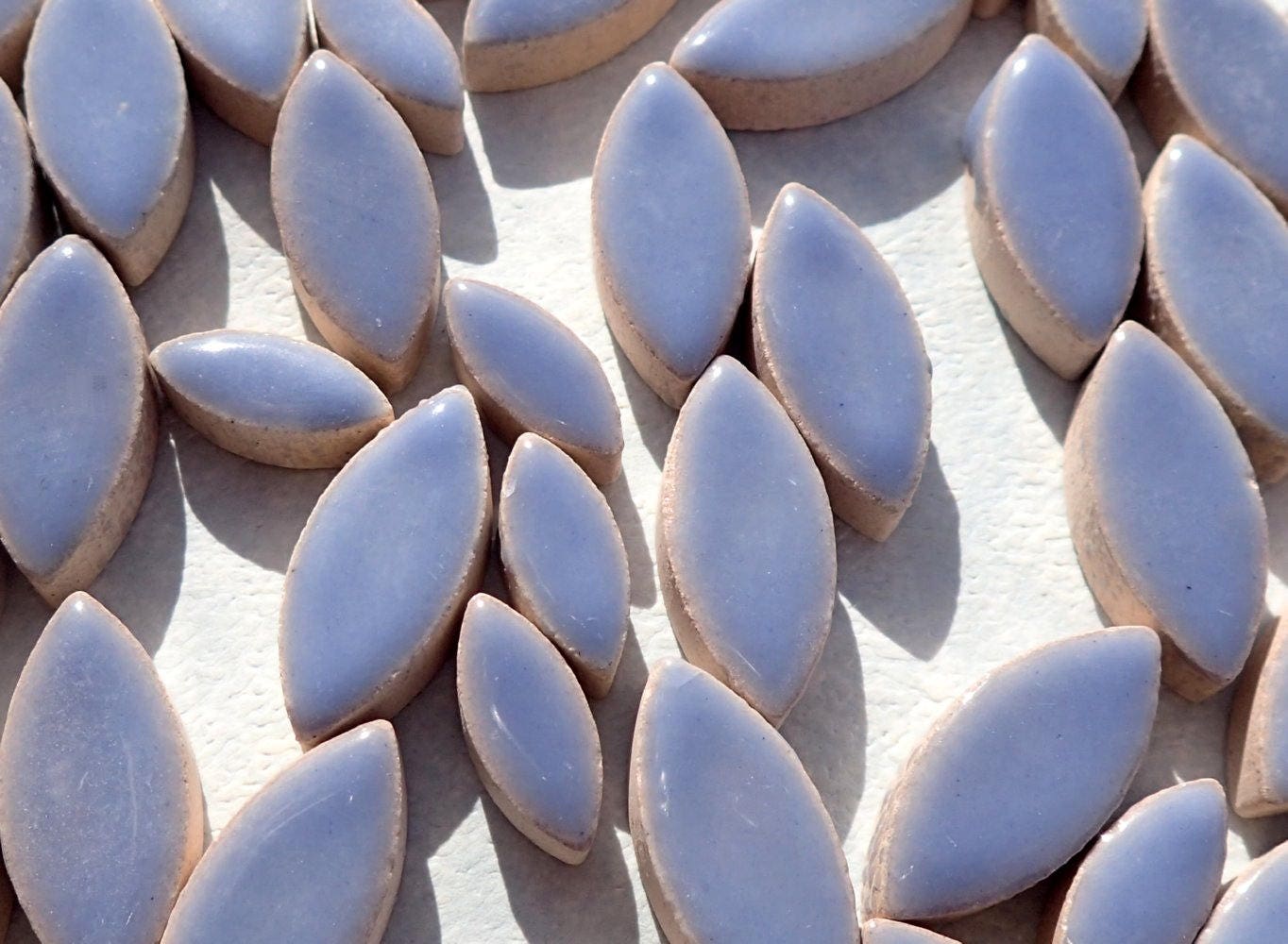 These petal tiles come in a mix of 2 different sizes: 1/2" long and 1/4" wide (13mm x 6mm) for the smaller petal, 3/4" long and 3/8" wide (20mm x 9.5mm) for the larger petal. Each petal is 1/5" (5mm) thick. While petals are obviously perfect for flowers, they also work for leaves and wings, along with other natural shapes. These are a cornflower blue color, starting to lean a little towards periwinkle.