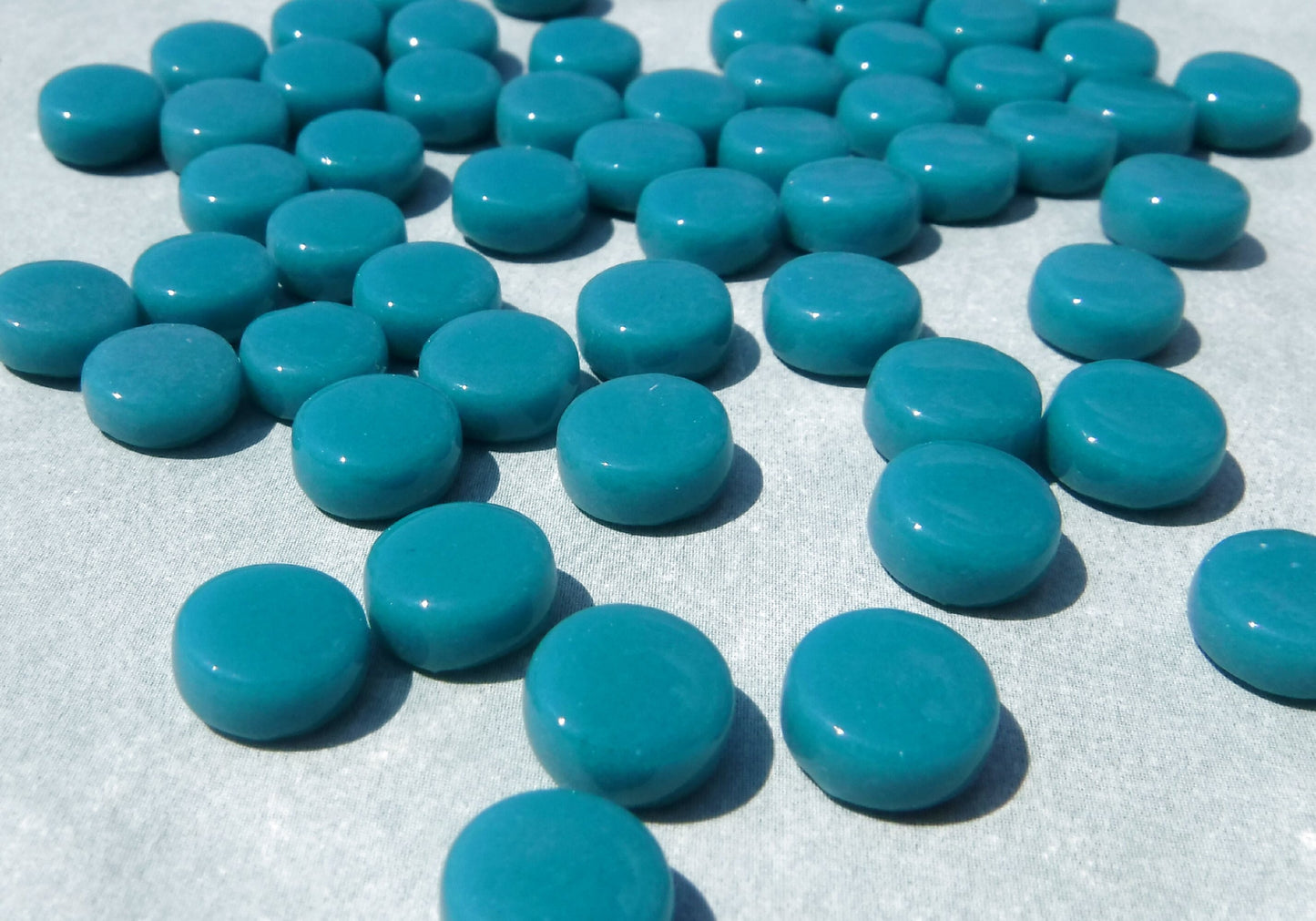These glass drops are a deep teal. They are the small size of 8mm (1/3") in diameter and are 4mm (1/6") thick. Unlike traditional glass gems, these are uniform circles with a flat top and straight sides.