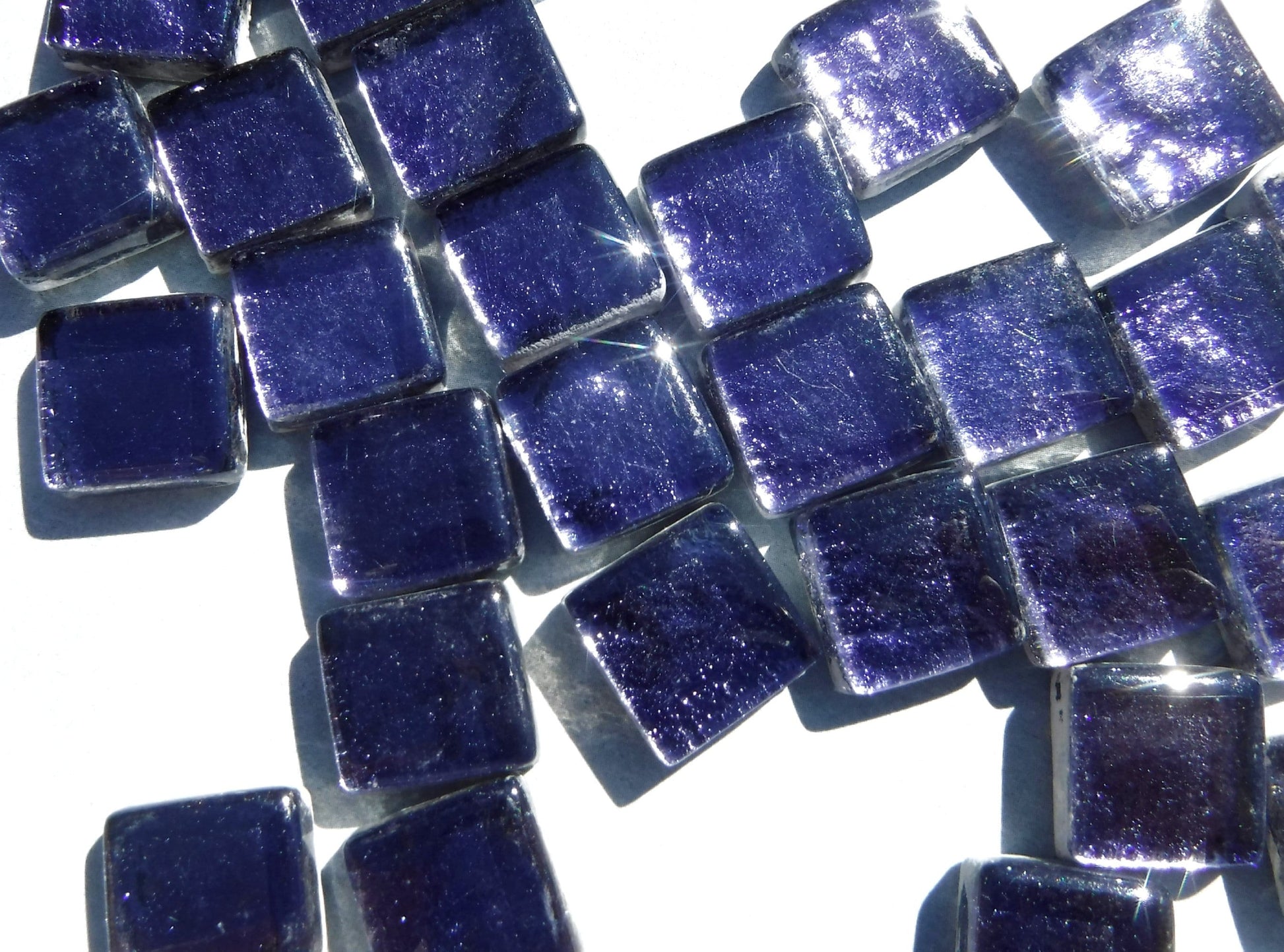 When something is dyed a really deep indigo, it has hints of both blue and purple. These metallic foil tiles are that color of dark indigo. They are approximately 12m x 12mm x 4mm. (1/2" x 1/2" x 1/6") They are made from handcut glass, so sizes can vary slightly.