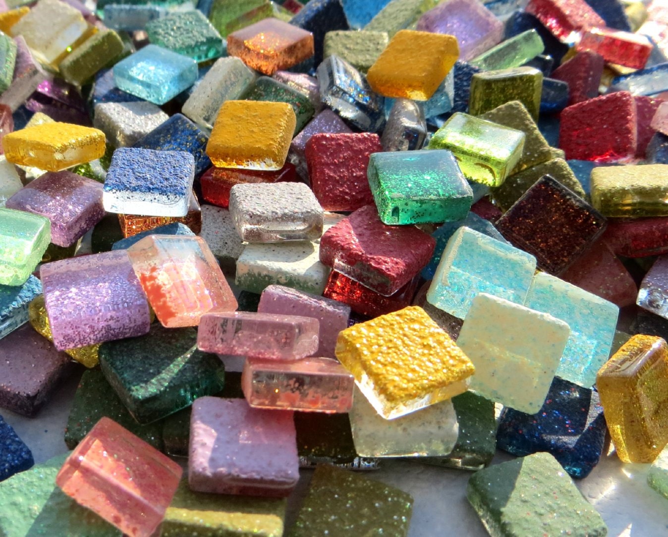 This is a set of small glass 1cm tiles that have a glitter backing. Because it is a backing, these tiles have depth to them. The glitter is in a large assortment of colors, some have a single color of glitter and some are mixed. There are light blues and dark blues, light greens and dark greens, light pinks and dark pinks. And many other colors! Something for every project!