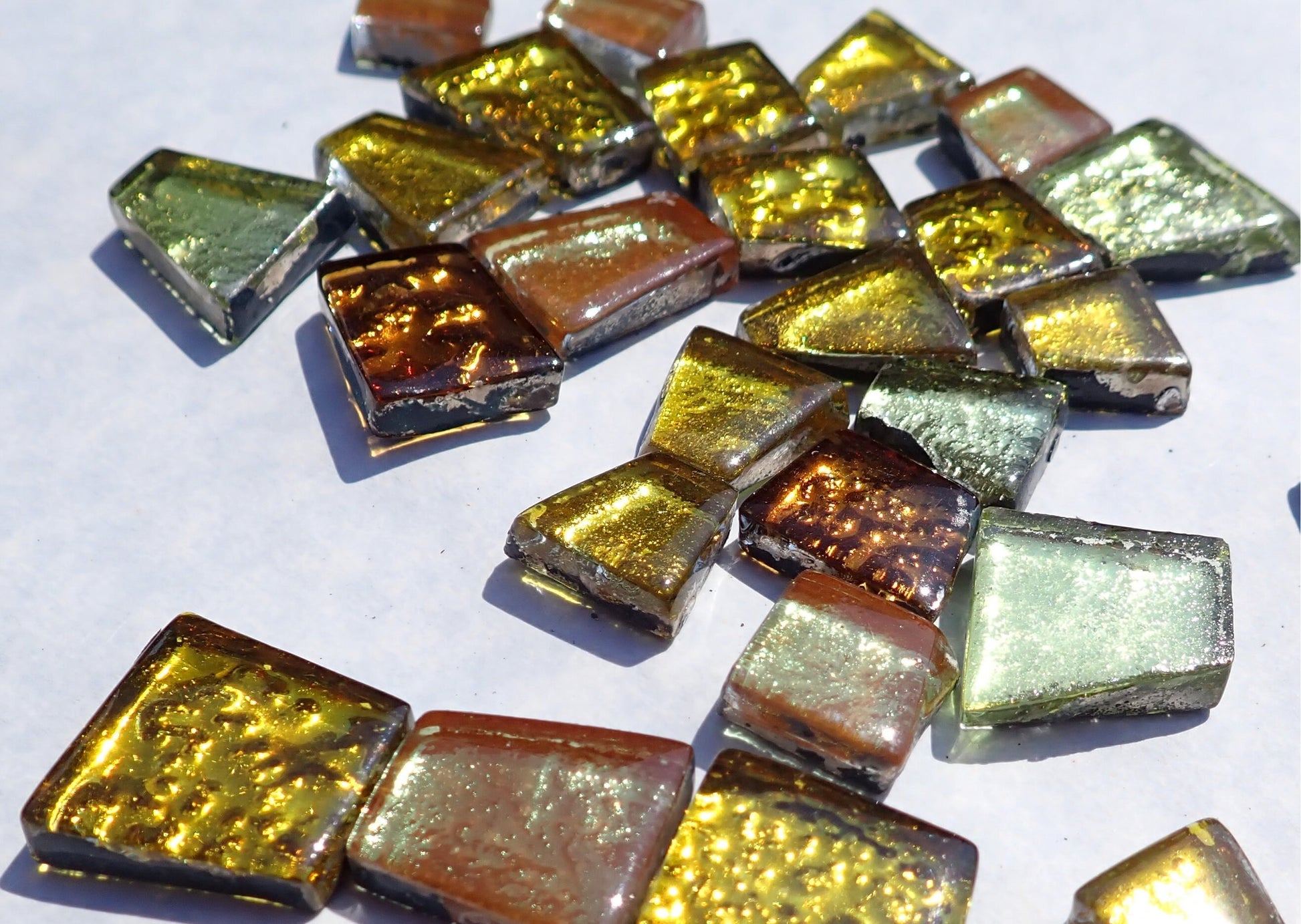 These glass tiles are in golds and bronzes as well as some copper greens. The metallic foil backing is smoother in some, with texture in others. They range in size from 12-25mm wide (.5 -1") and 3.5mm (.13") thick. These are double-fired for rounded edges.