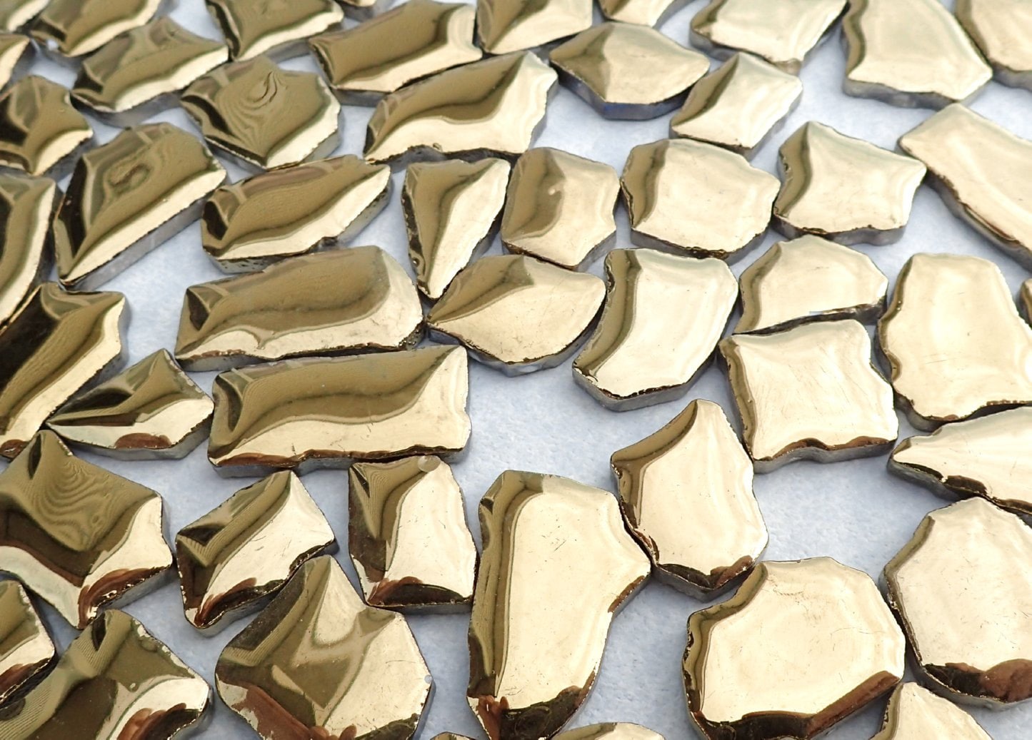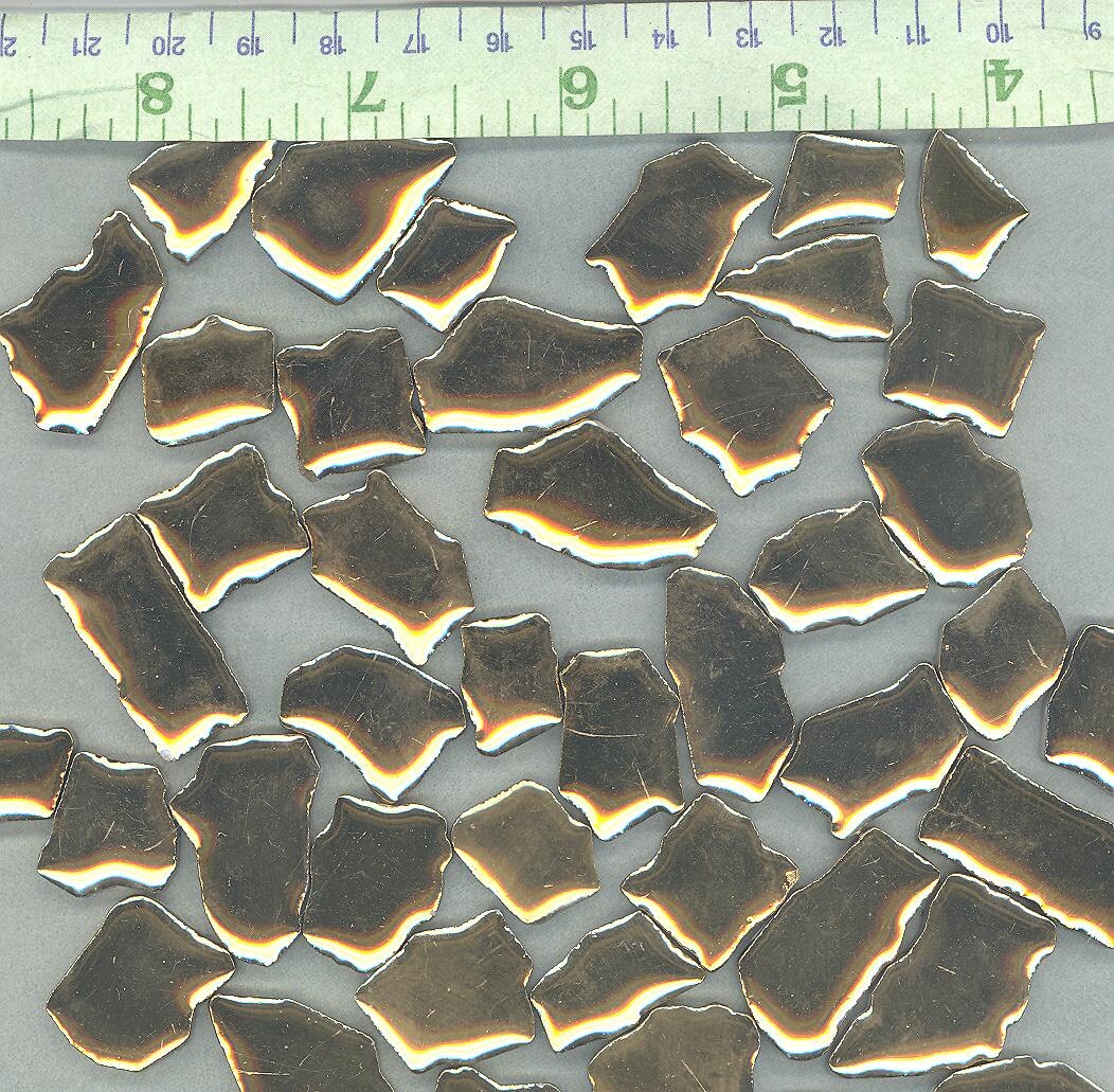 This an assortment of randomly shaped gold toned mosaic tiles. It is a fairly shiny gold metallic finish (perhaps not quite as shiny as they seem in the photo). They are fun with unusual curves and edges. Get that great shape with no nipping! Something for every project! This is 100 grams of ceramic tiles. Since the sizes of the pieces differ, so will the number of tiles. But 100 grams is approximately 65 pieces.
