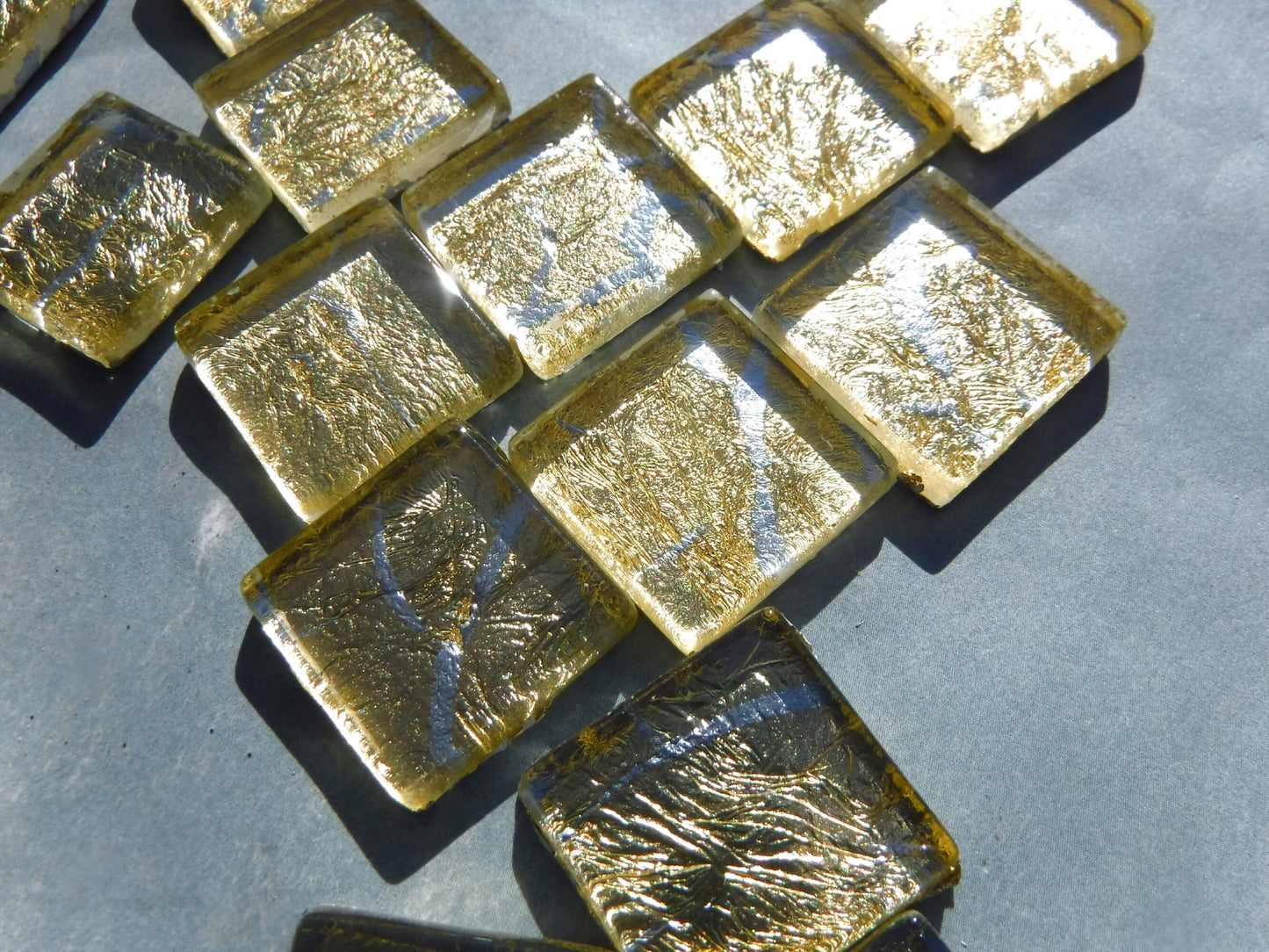 These lovely tiles are gold foil with silver foil running through them. The color and texture is from foil beneath the glass tiles. These are 20mm (3/4"), and are 4mm (1/6") thick.