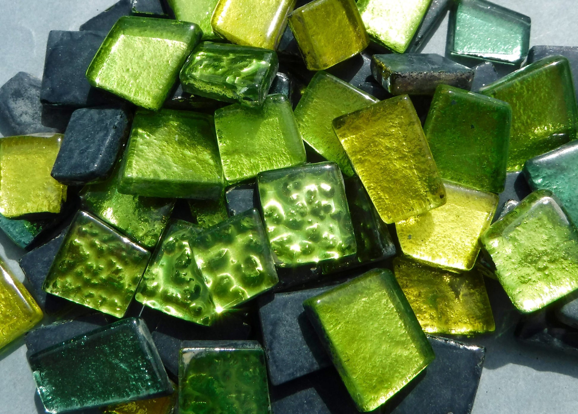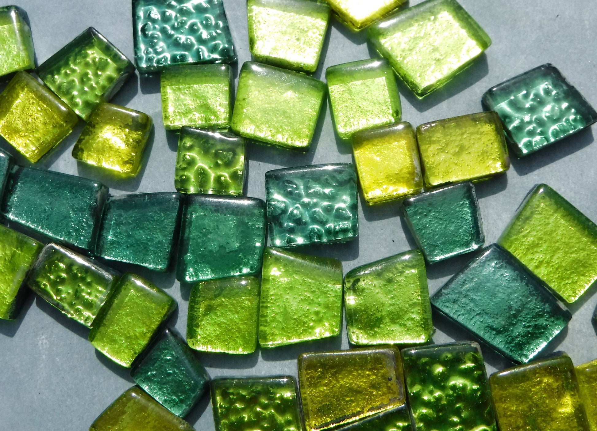 These glass tiles are in a bright yellow and several shades of green, ranging from chartreuse to a darker green. The metallic foil backing is smoother in some, with texture in others. They range in size from 12-25mm wide (.5 -1") and 3.5mm (.13") thick. These are double-fired for rounded edges.