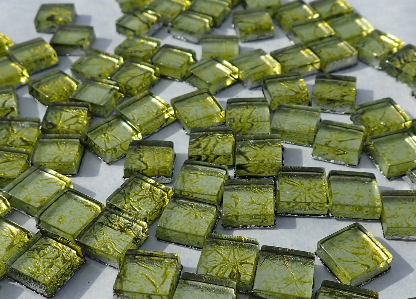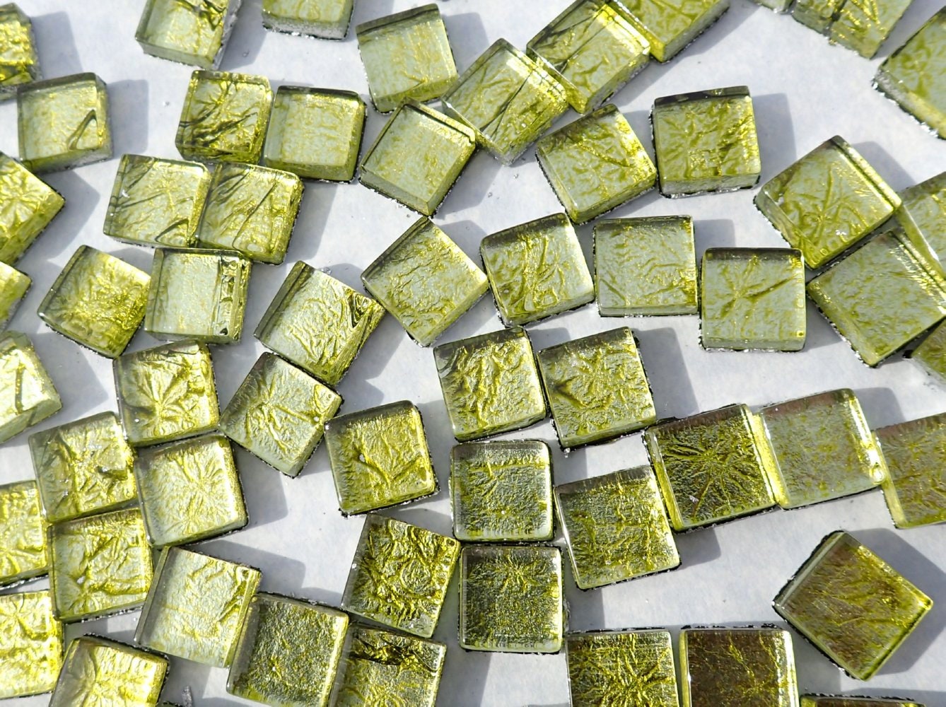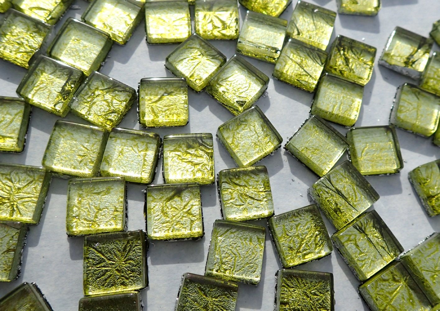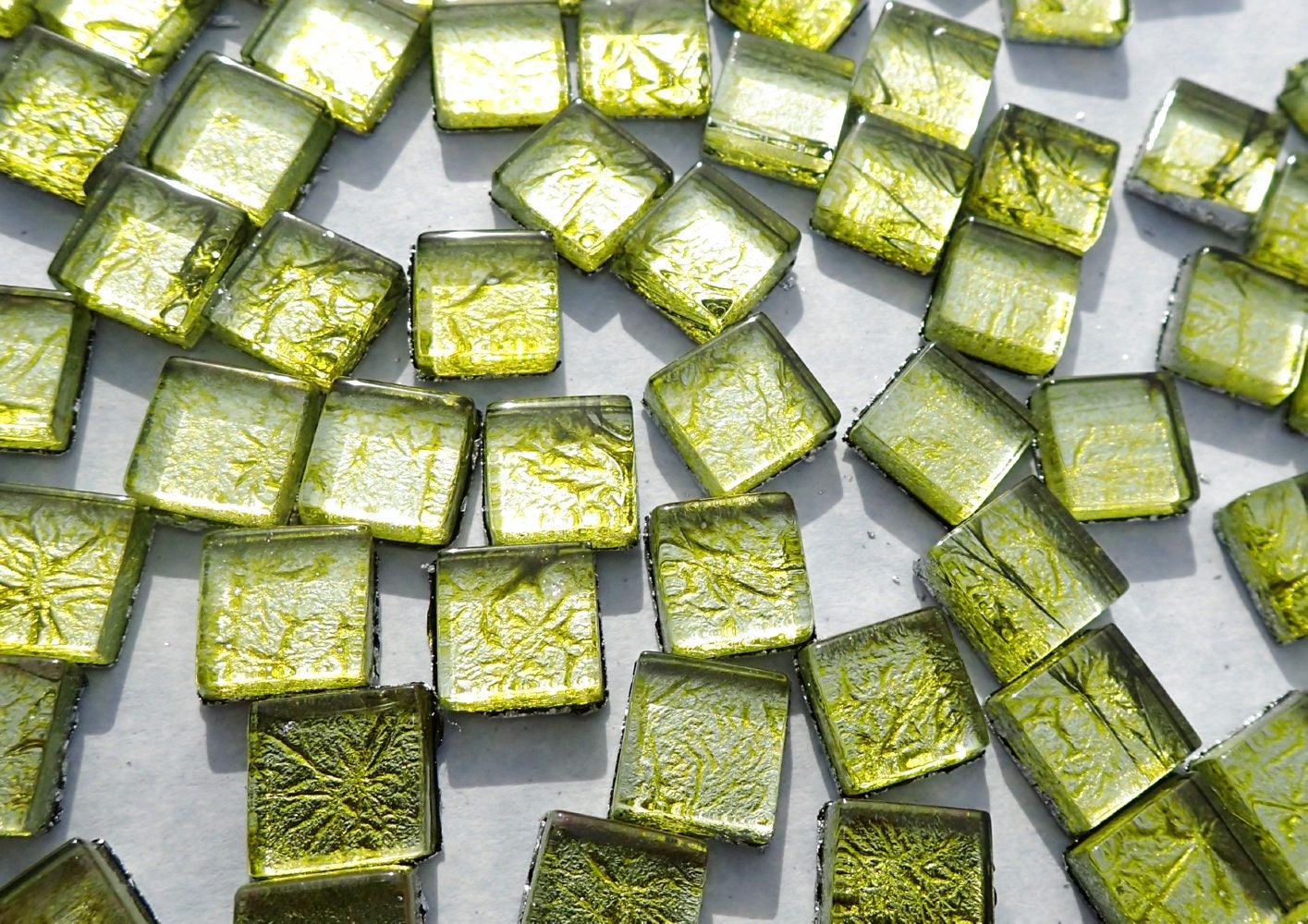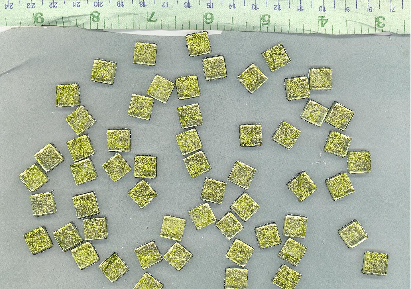 Green Foil Square Crystal Tiles - 10mm - 50g Metallic Glass Tiles in Chartreuse - Approx 50 Tiles