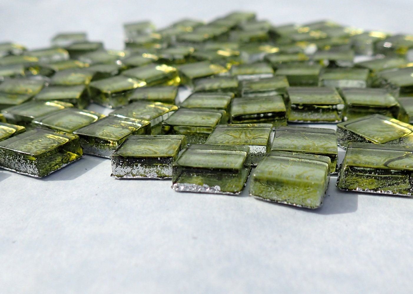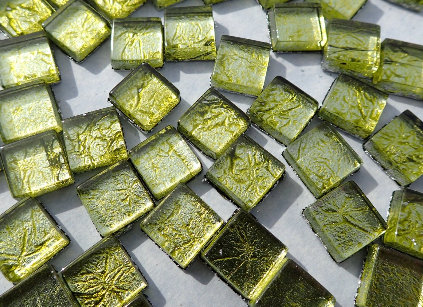 These square foil mosaic tiles are in a muted green color. They are 1cm x 1cm x 4mm. (3/8" x 3/8" x 1/6") They are made with hot molded float glass for a smooth surface and edges. The colored and textured metallic foil will be a nice addition to your mosaic project.