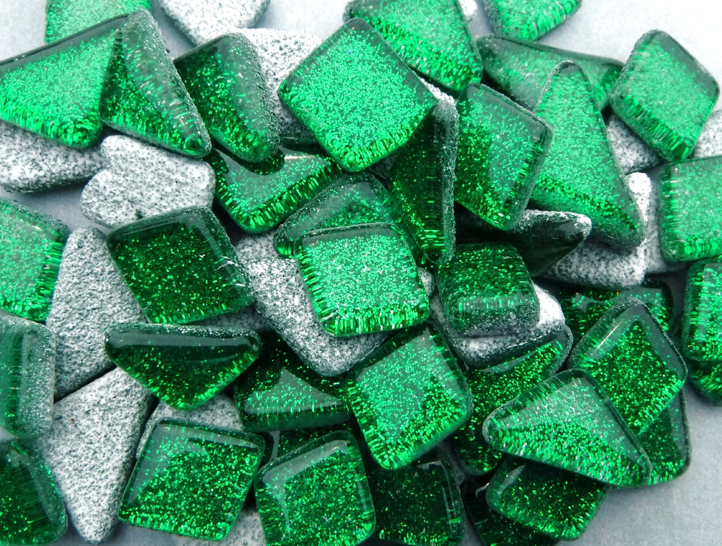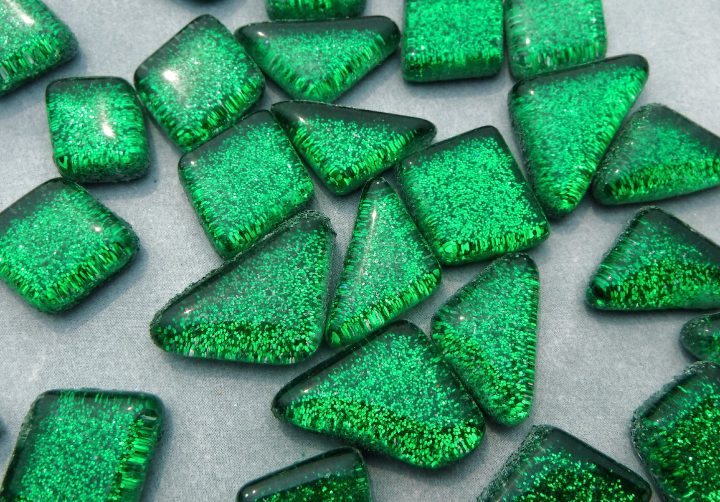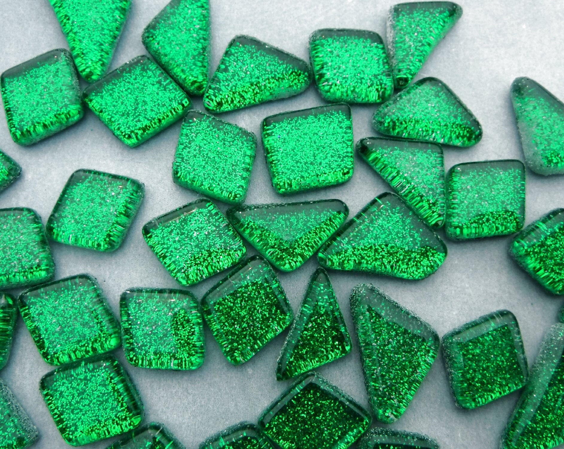 Green Glitter Puzzle Tiles - 100 grams in Assorted Shapes Glass Mosaic Tiles in Deep Forest Green