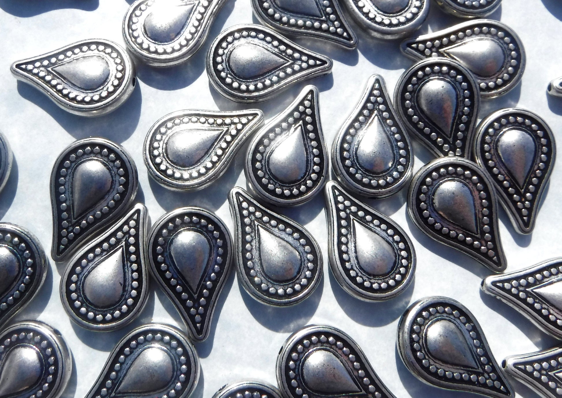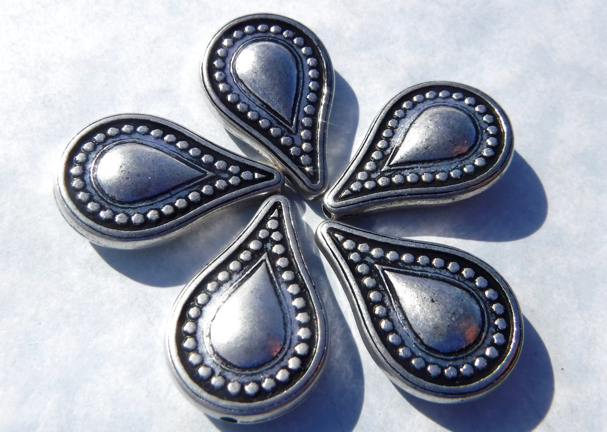 Large Metallic Tear Drop Beads - Silver-Toned 25mm Detailed Beads