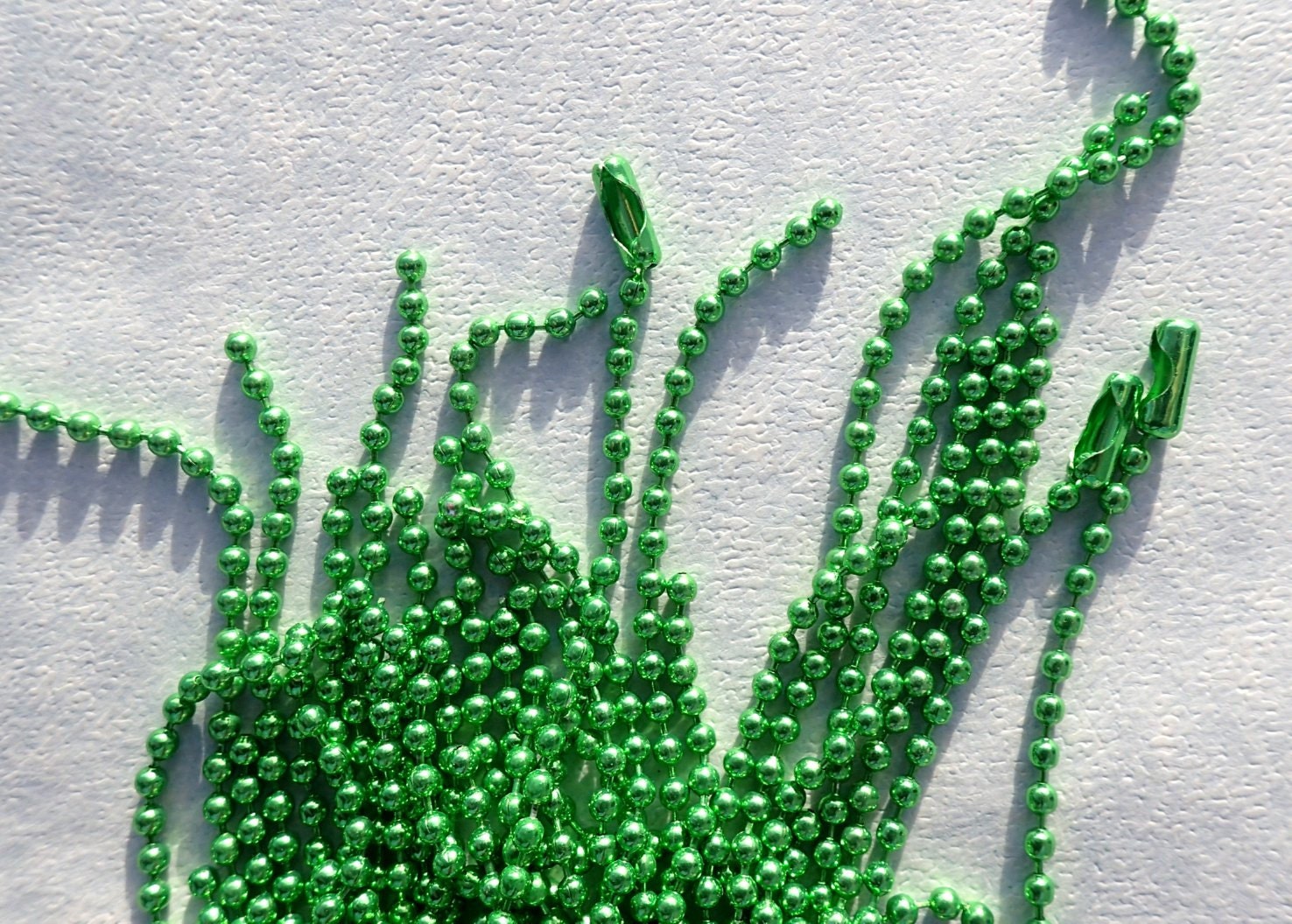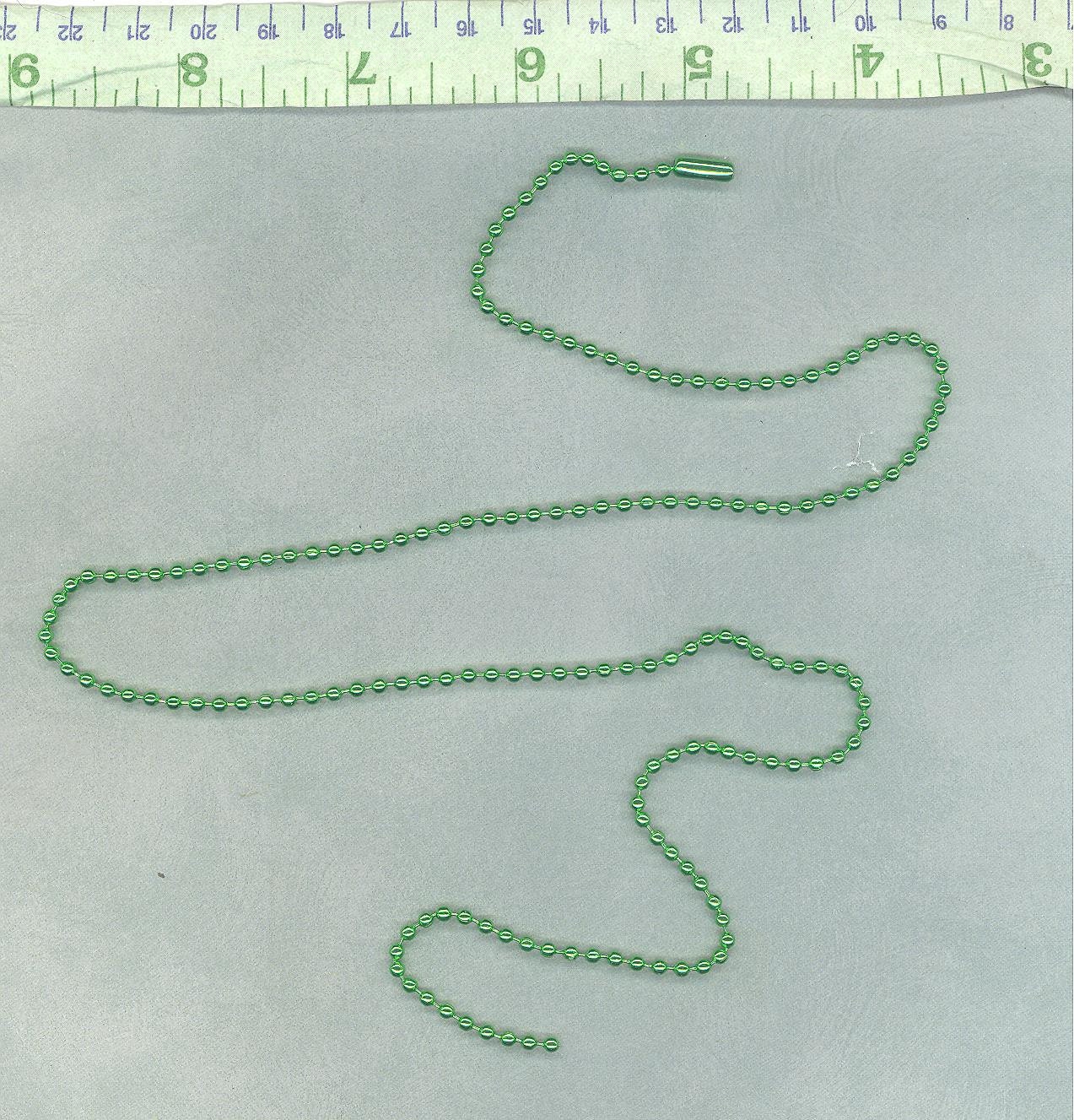These are 10 green colored ball chains that are 24" in length. They are 2.4mm in diameter. Ball chains are versatile because you can use household scissors to cut them down to the desired length. Each chain includes the connector.