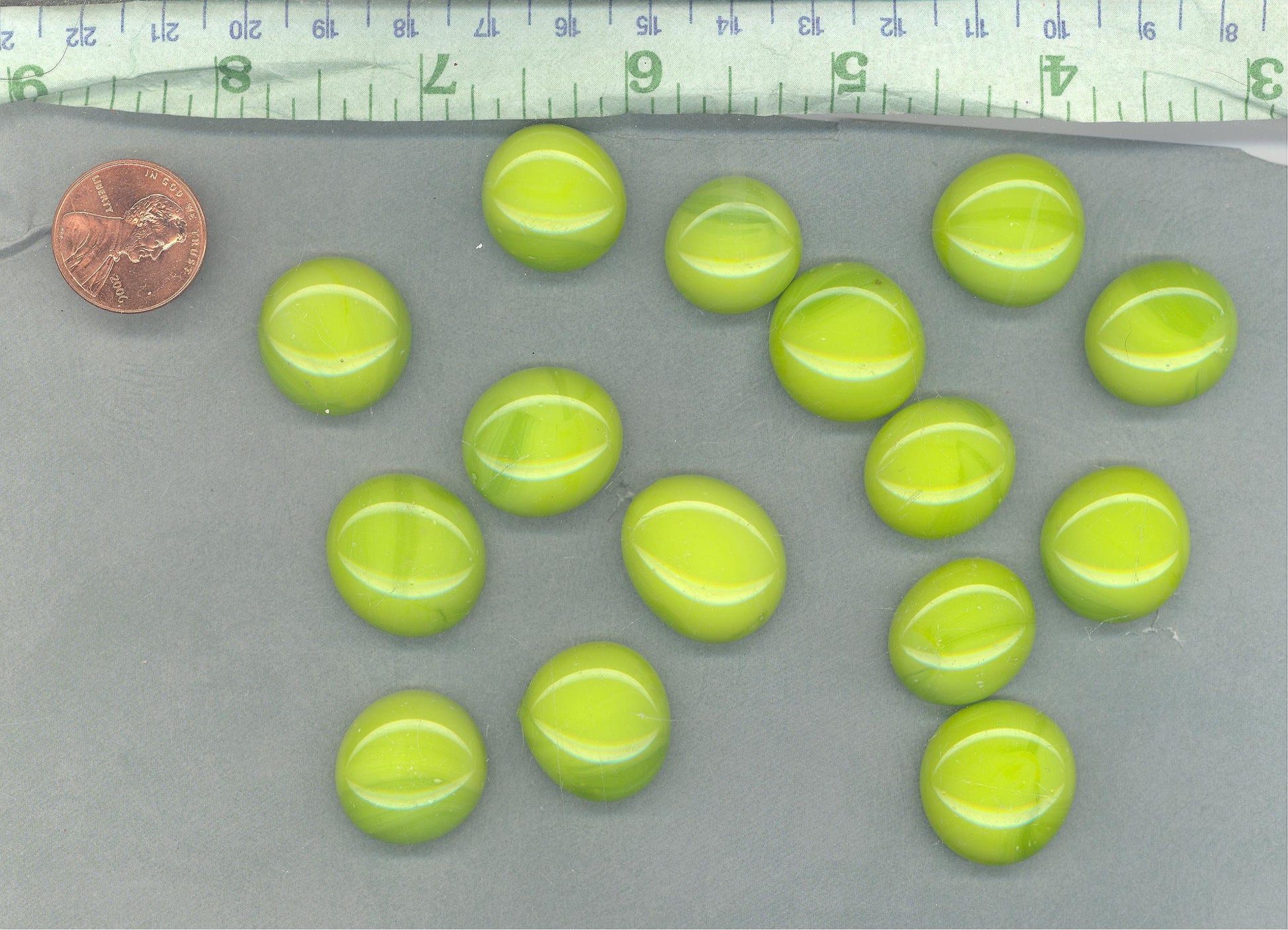 These are lime green glass gems. They are a bright green with faint streaks of lighter and darker green running through them to give them a more interesting appearance. They are 16-19mm in size. This is a set of 25.