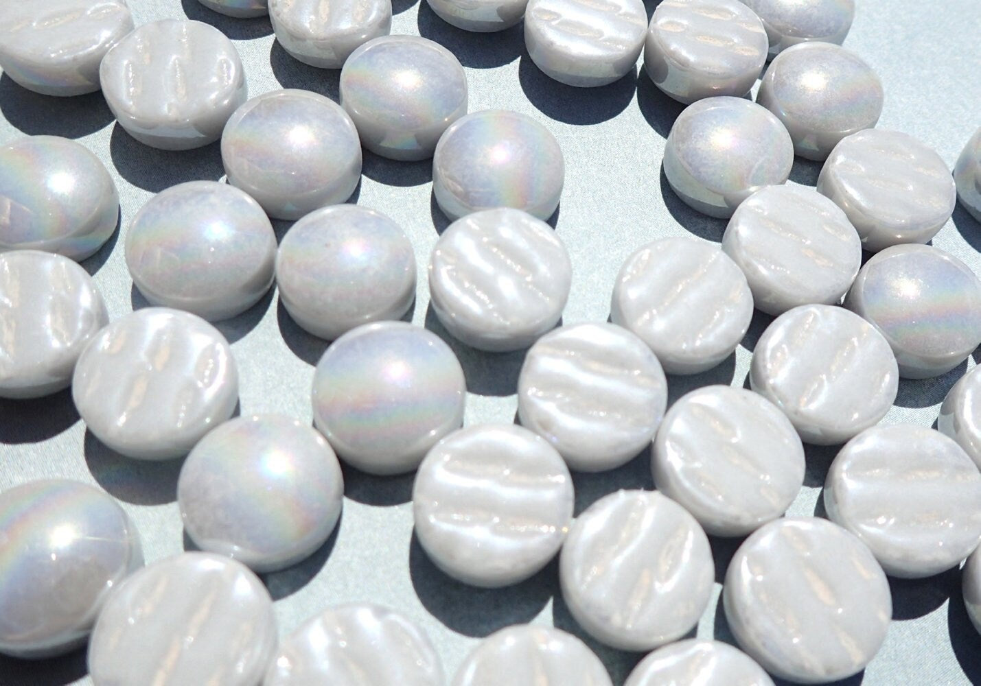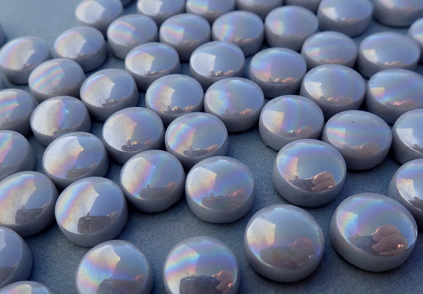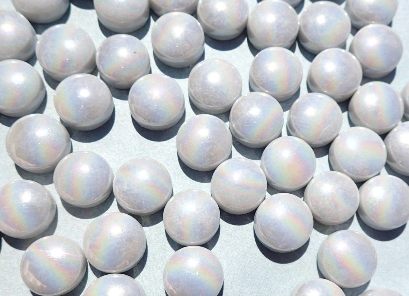 These glass drops are a light gray color with an iridized finish. They are 12mm (1/2") in diameter and are 8mm (1/3") thick. Unlike traditional glass gems, these are uniform circles with a domed top and straight sides.