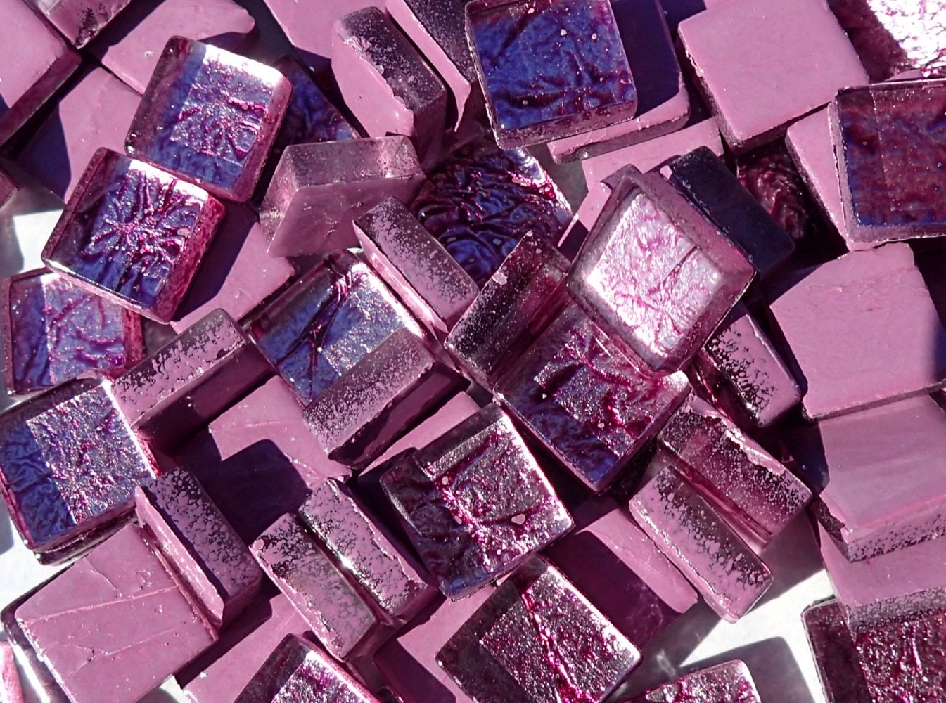 These square foil mosaic tiles are in a light purple color. They are 1cm x 1cm x 4mm. (3/8" x 3/8" x 1/6") They are made with hot molded float glass for a smooth surface and edges. The colored and textured metallic foil will be a nice addition to your mosaic project.
