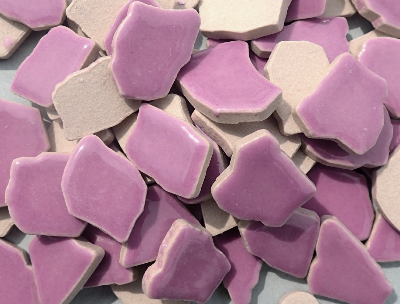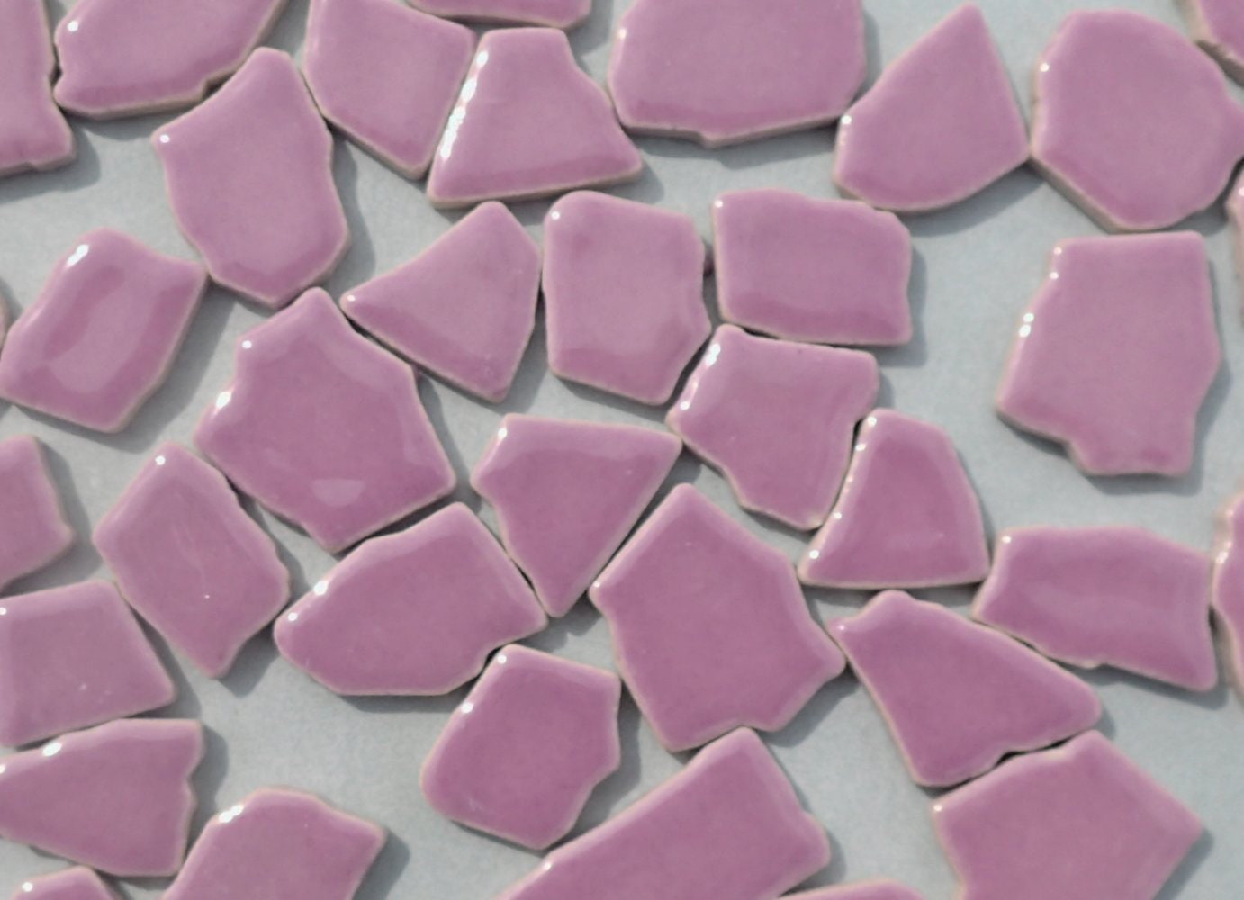 These tiles are a medium purple color. This an assortment of randomly shaped mosaic tiles. They are fun with unusual curves and edges. Get that great shape with no nipping! Something for every project! This is a half pound of ceramic tiles. Since the sizes of the pieces differ, so will the number of tiles. But a half pound of tiles is approximately 90-100 tiles.