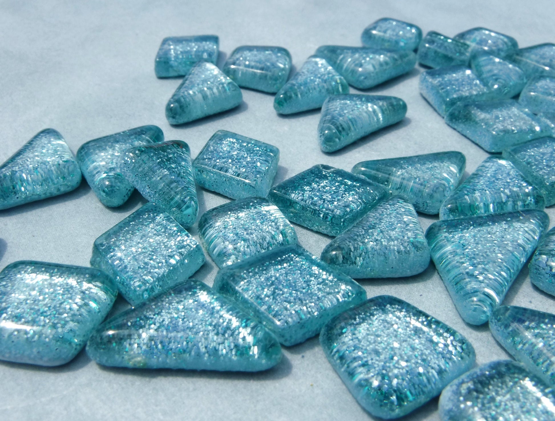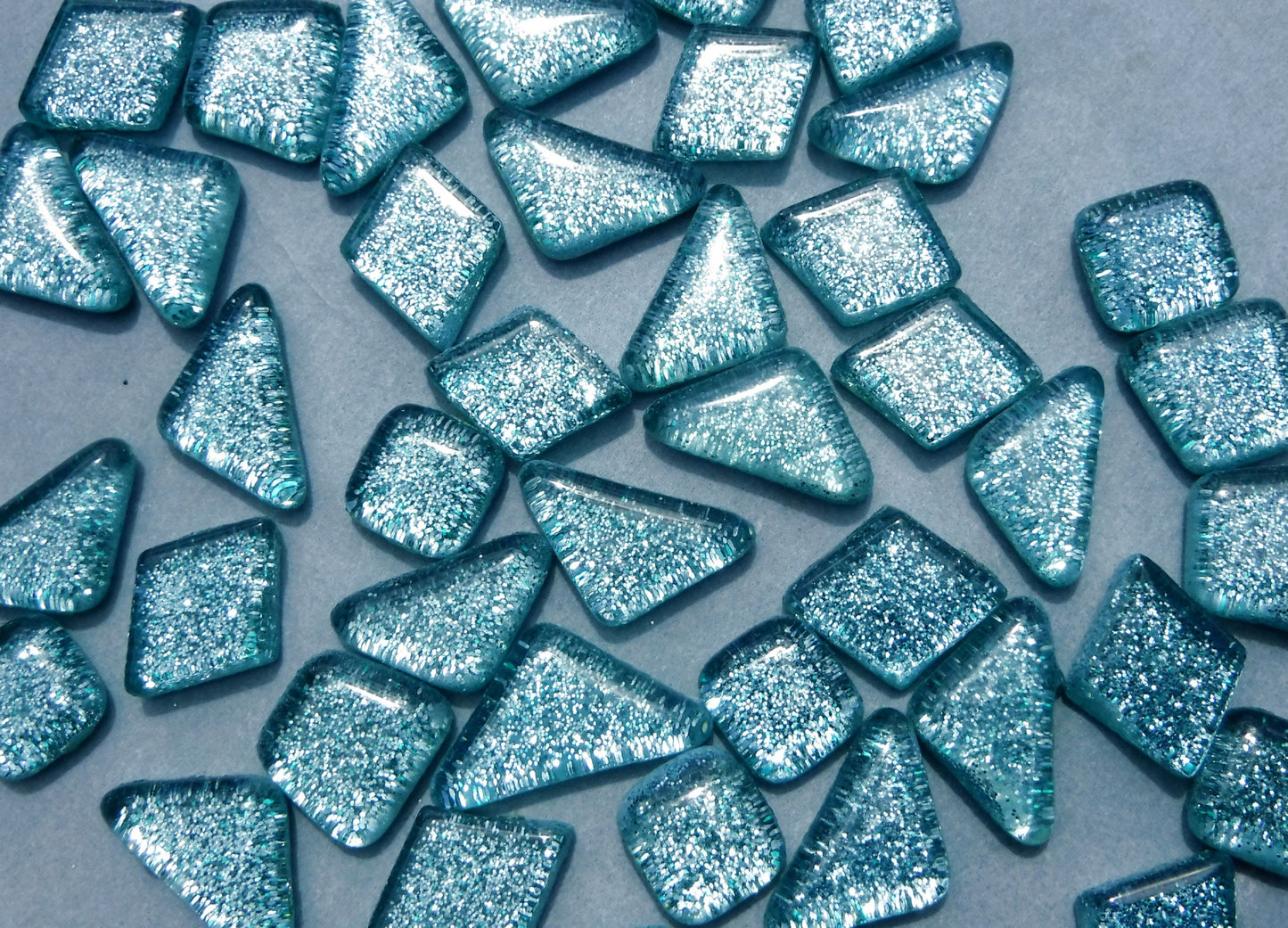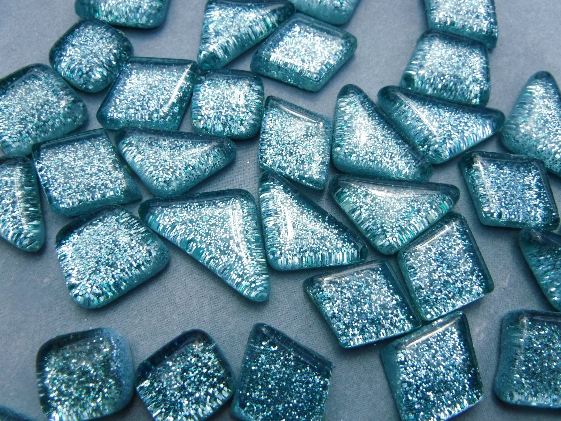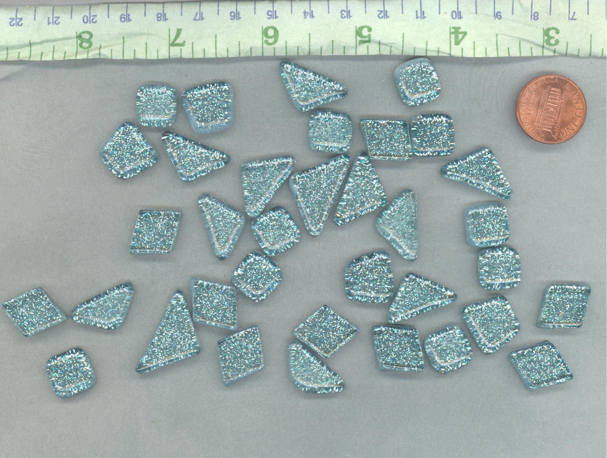 This is 100g of small glass tiles that have a glitter backing. These tiles are irregular shaped molded glass tiles with a color glitter film bonded to the back. The edges are smooth and rounded. While the shapes can vary a bit, with the sizes ranging from 10mm to 20mm. They are 1/8" thick.