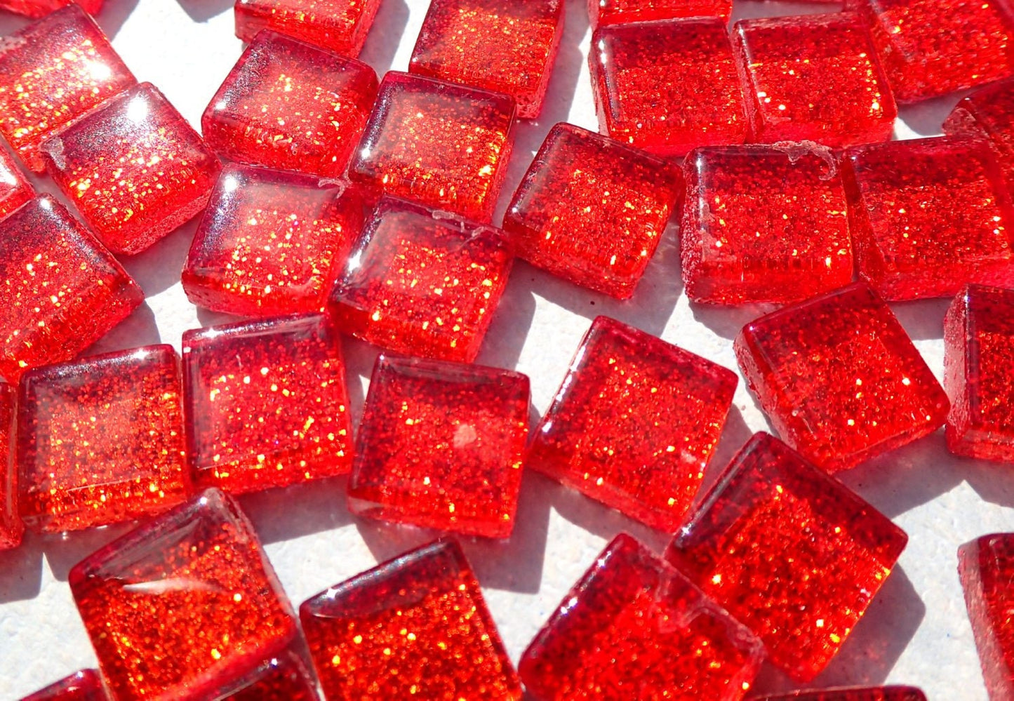 This is a set of 100g of mini glass 1cm (3/8") tiles that have a glitter backing. Because it is a backing, these tiles have depth to them. The glitter is a candy apple red. It will definitely make your project POP!