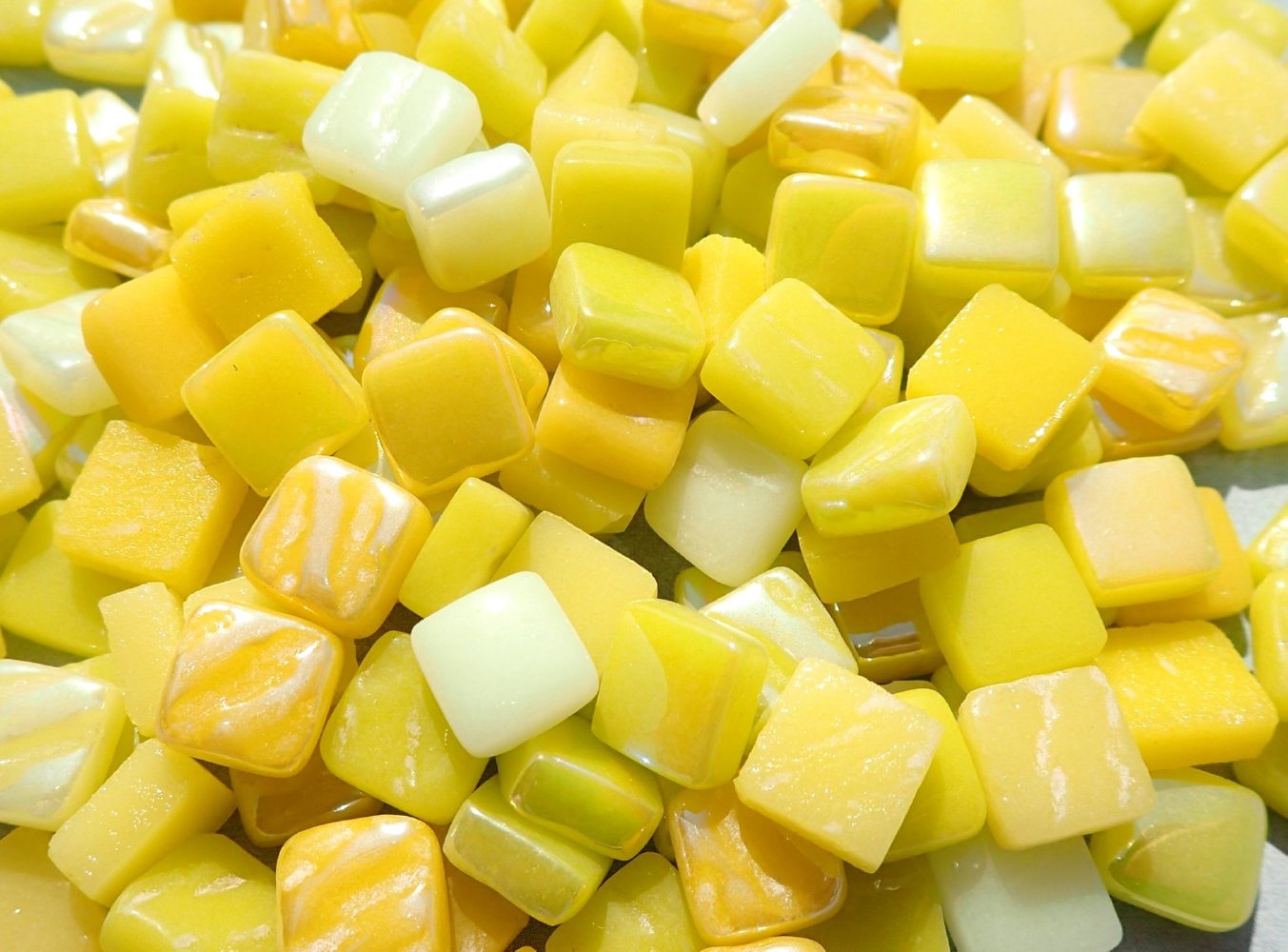 This is a set of mix of yellow glass tiles, ranging from pale yellow to bright yellow, with a few that have a hint of green, similar to a bag of ripening lemons. They are 8x8x4mm (1/3"x1/3"x1/6") in size. Some have an iridescent finish, others are glossy, while some have a somewhat rough matte finish. The tops are smooth while the bottoms are textured for better adhesion.