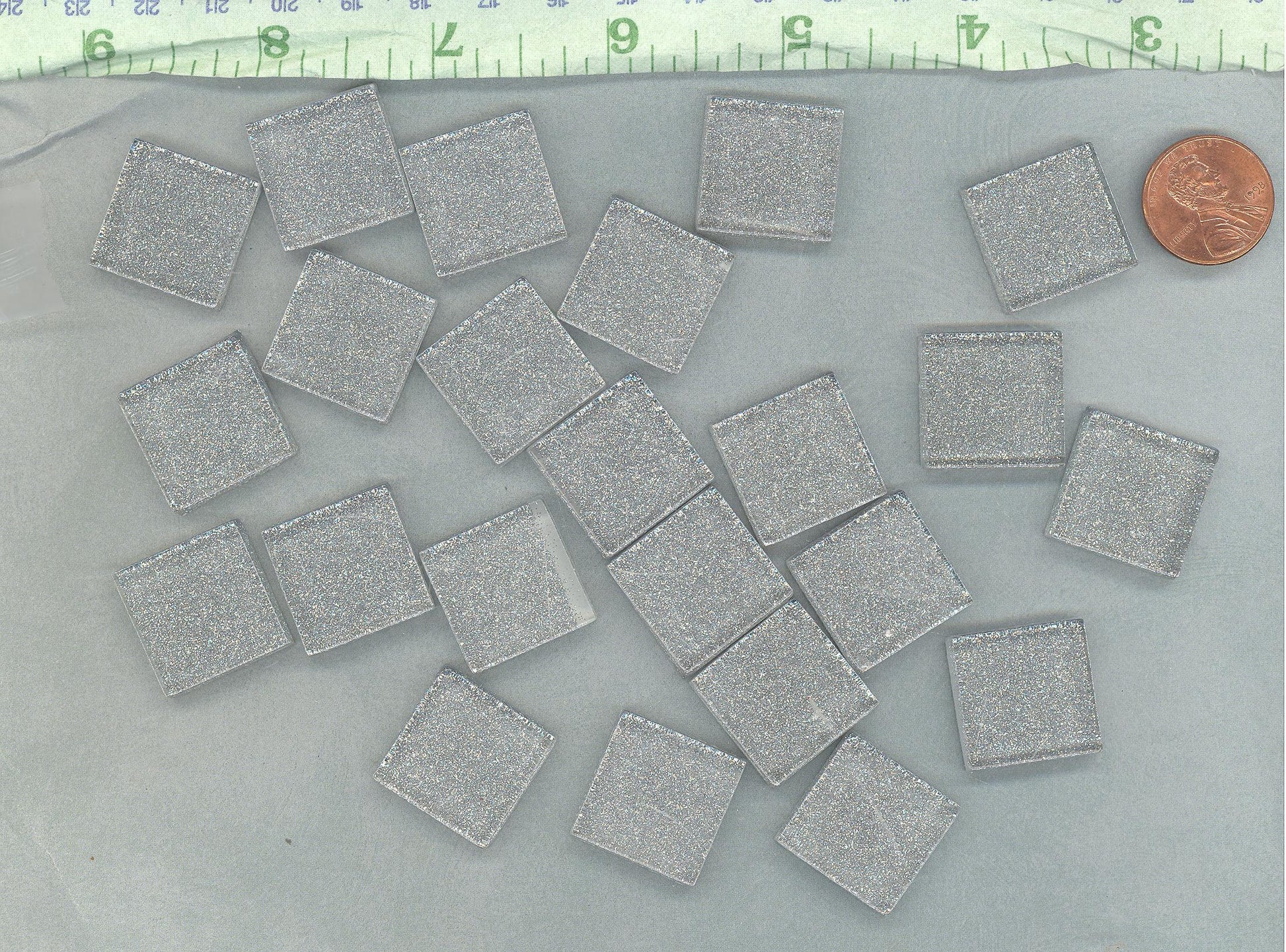 This is a set of 25 glass 20mm (4/5") tiles that have a glitter backing. Because it is a backing, these tiles have depth to them. The glitter is silver.