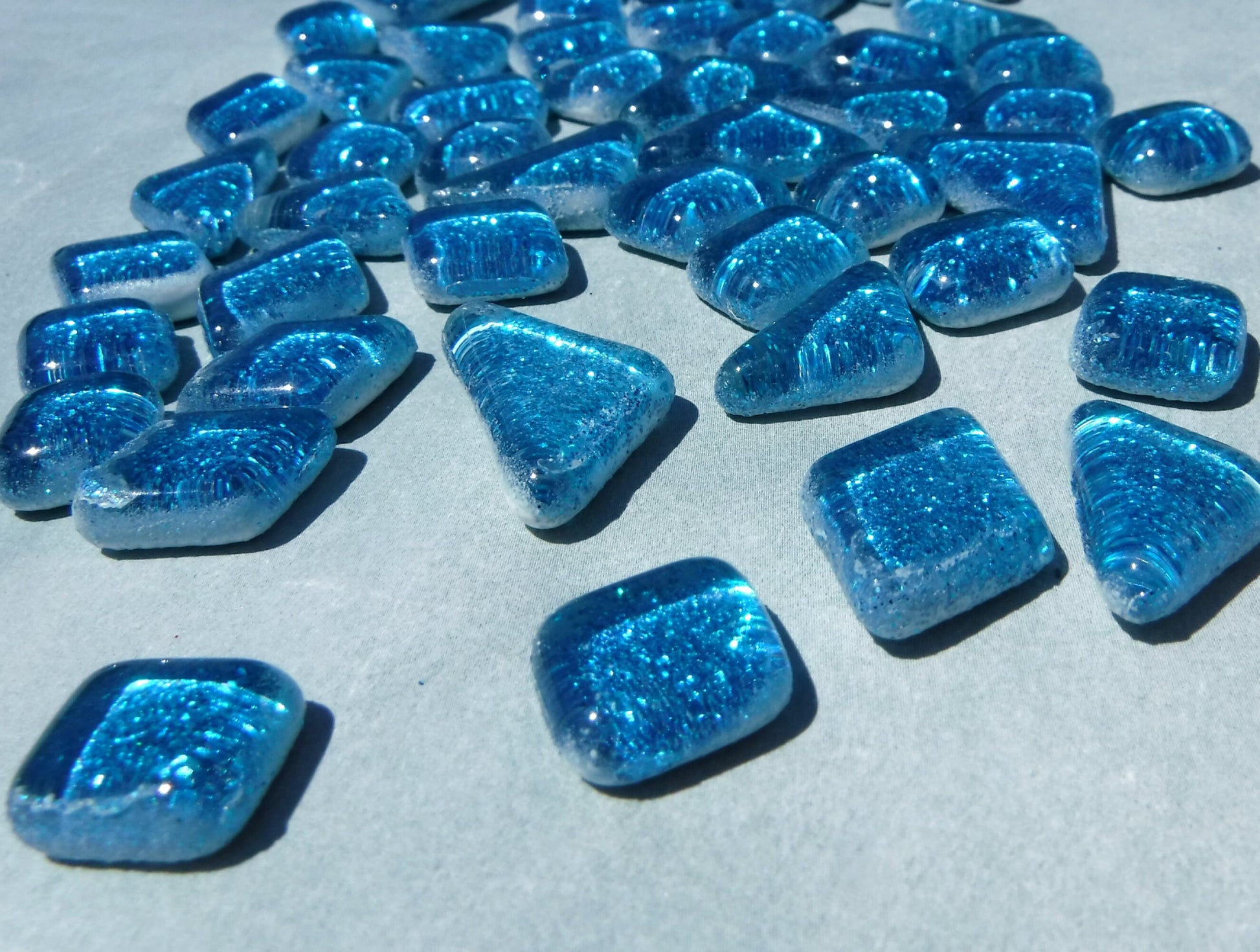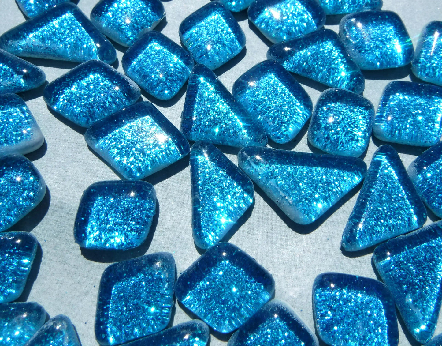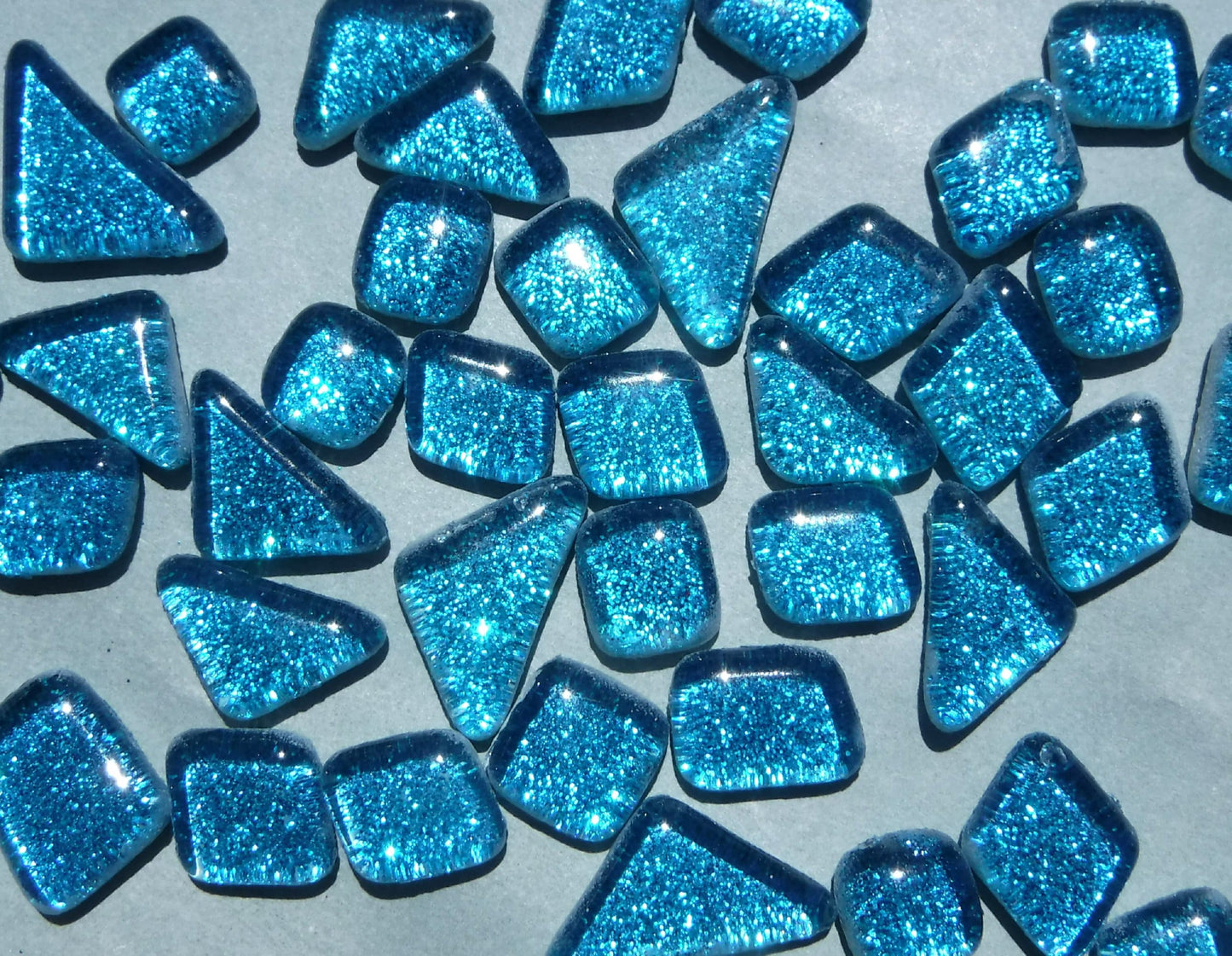 This is 100g of small glass tiles that have a glitter backing. These tiles are irregular shaped molded glass tiles with a color glitter film bonded to the back. The edges are smooth and rounded. While the shapes can vary a bit, with the sizes ranging from 10mm to 20mm. They are 1/8" thick.
