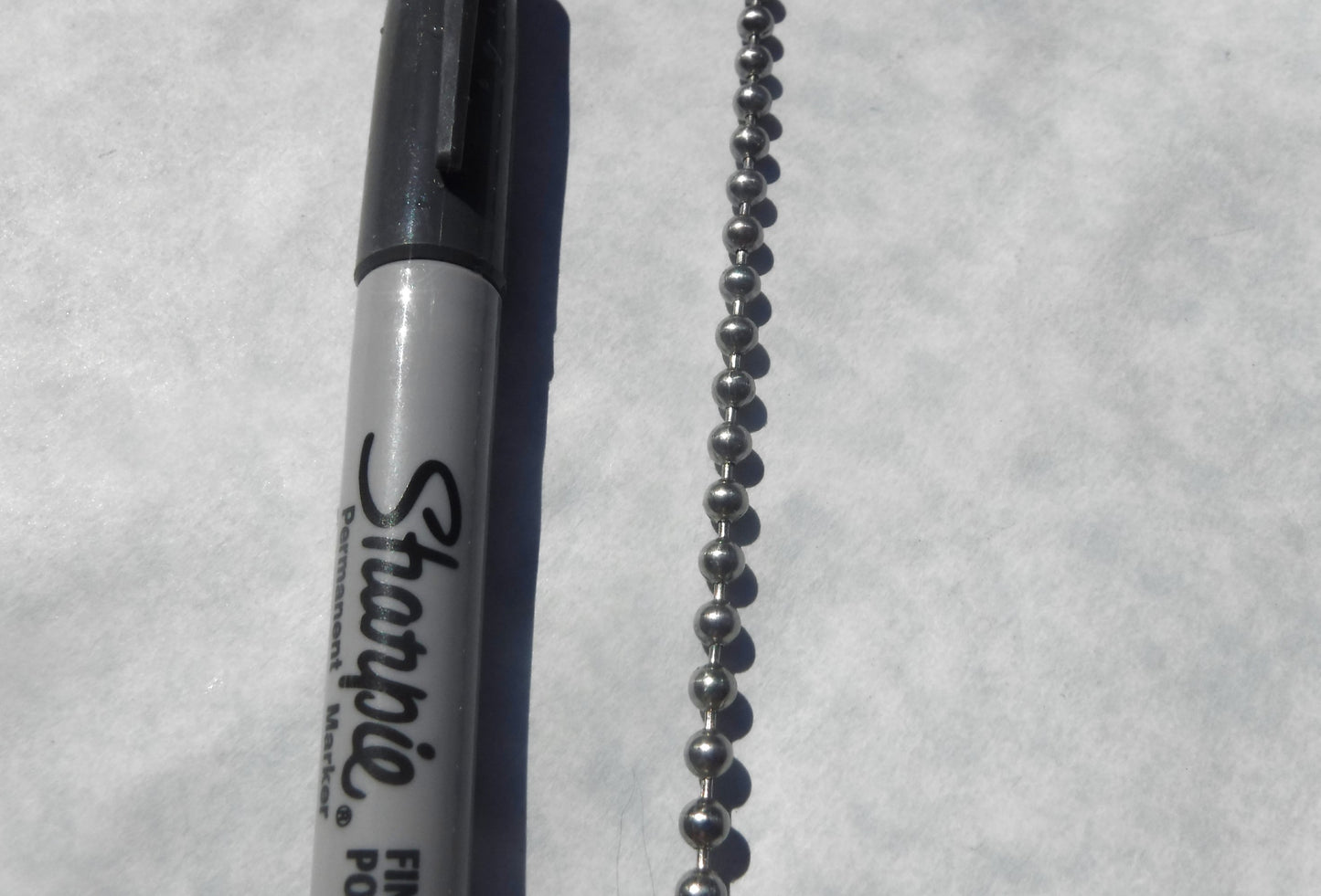This is chunky stainless steel ball chain. It is 4mm (5/32") in size and averages about 56 balls per foot.
