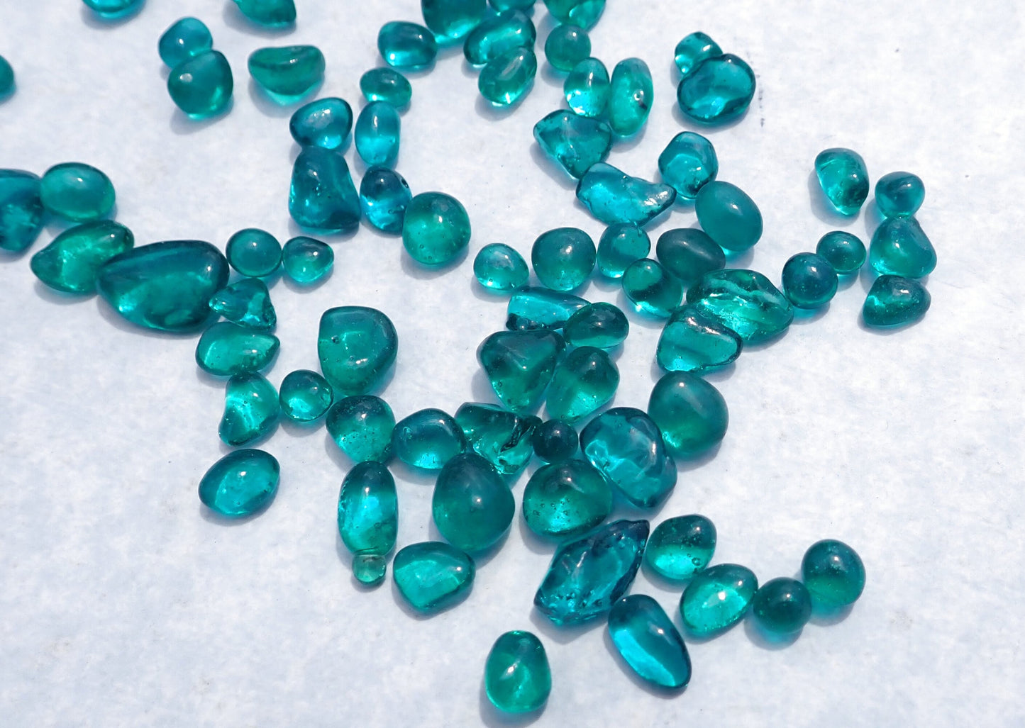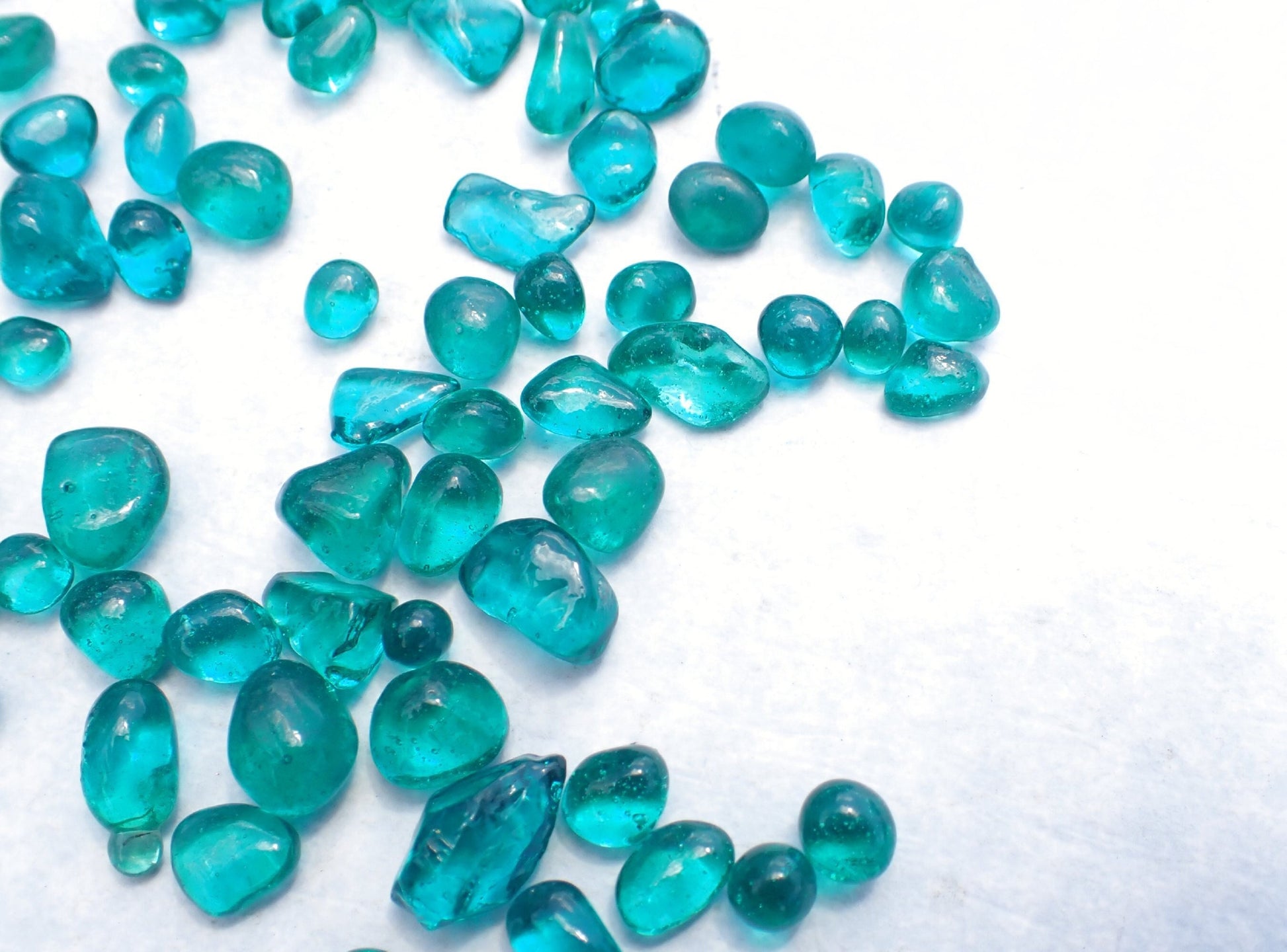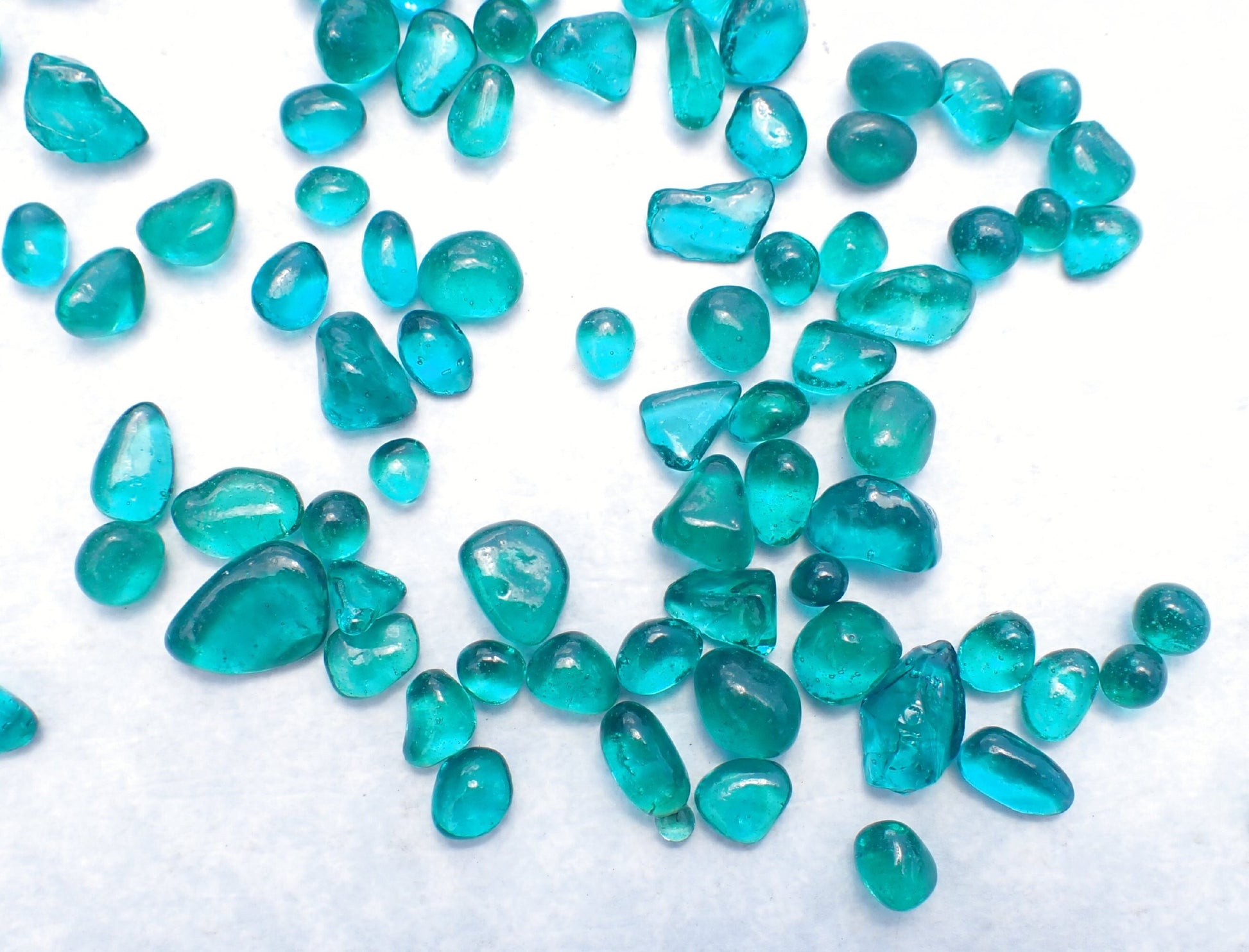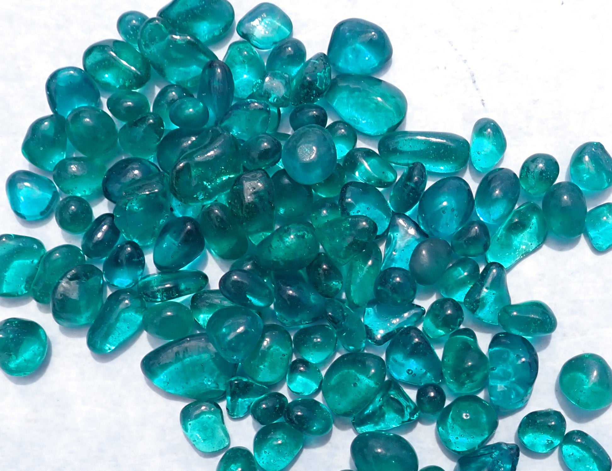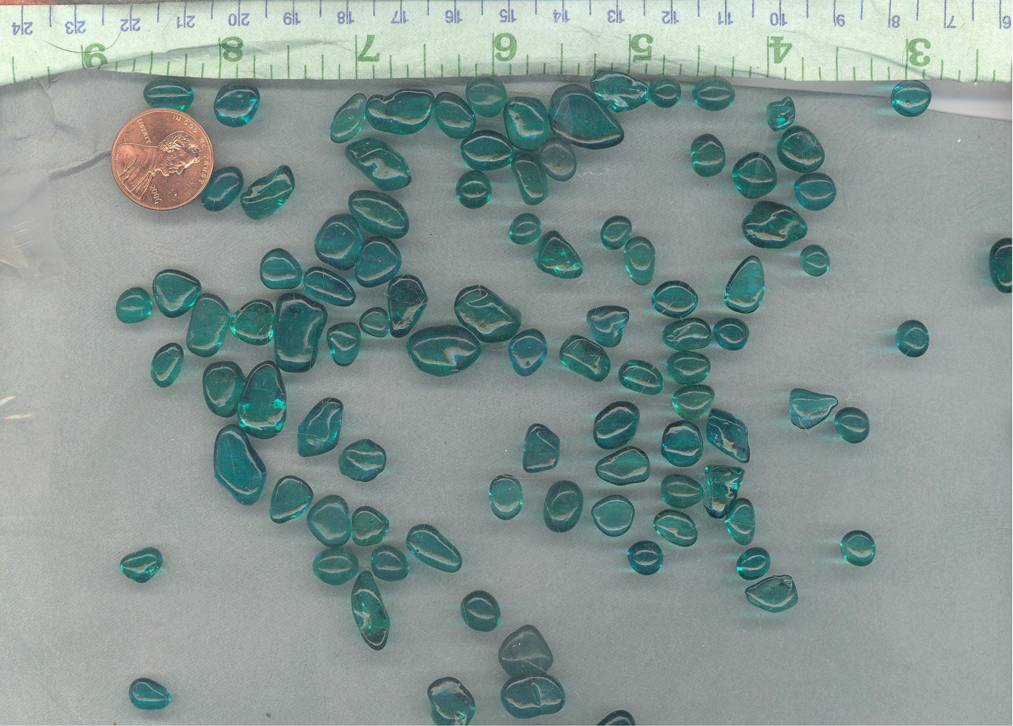These glass pebbles will add some organic shapes to your mosaic, while still supplying color and endurance! They are clear teal green glass. They are lightly tumbled so that they have smooth edges. They range in size from .15" to .75" (4-19mm). A half pound is over a half cup of gravel.