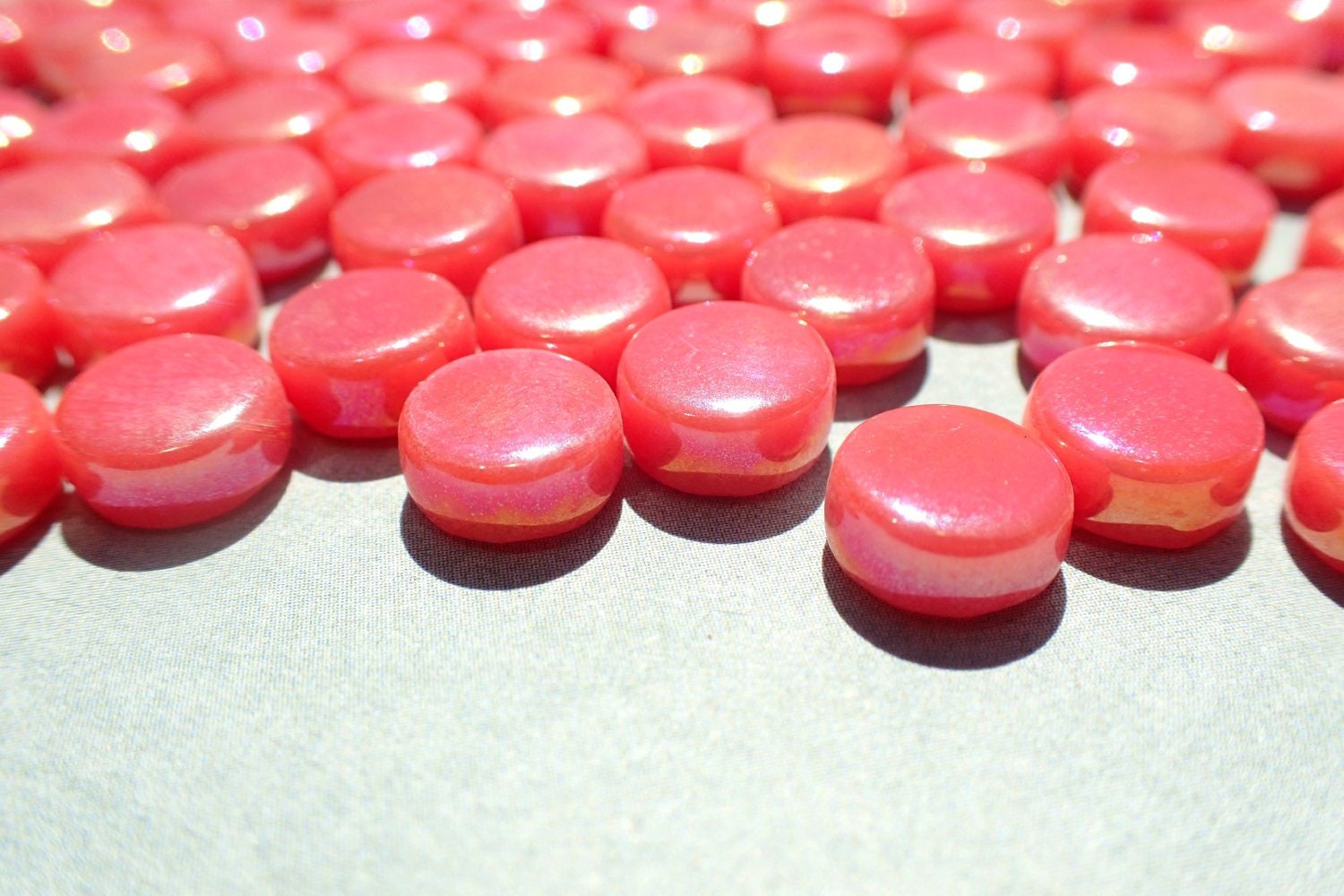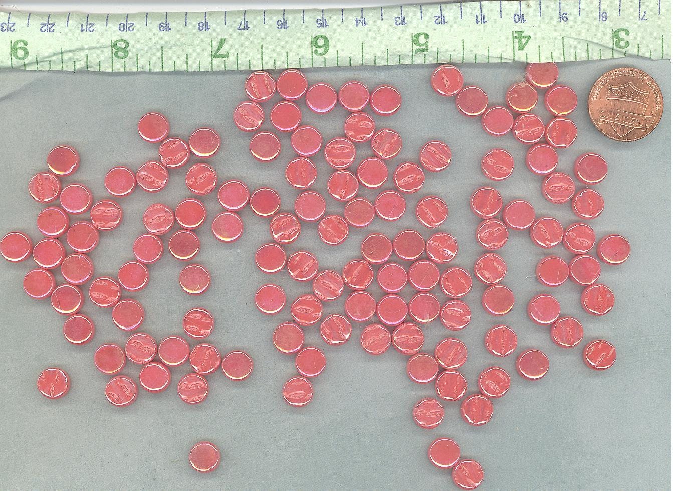 These glass drops are a light red color, similar to watermelon, with an iridized finish. They are the small size of 8mm (1/3") in diameter and are 4mm (1/6") thick. Unlike traditional glass gems, these are uniform circles with a domed top and straight sides.