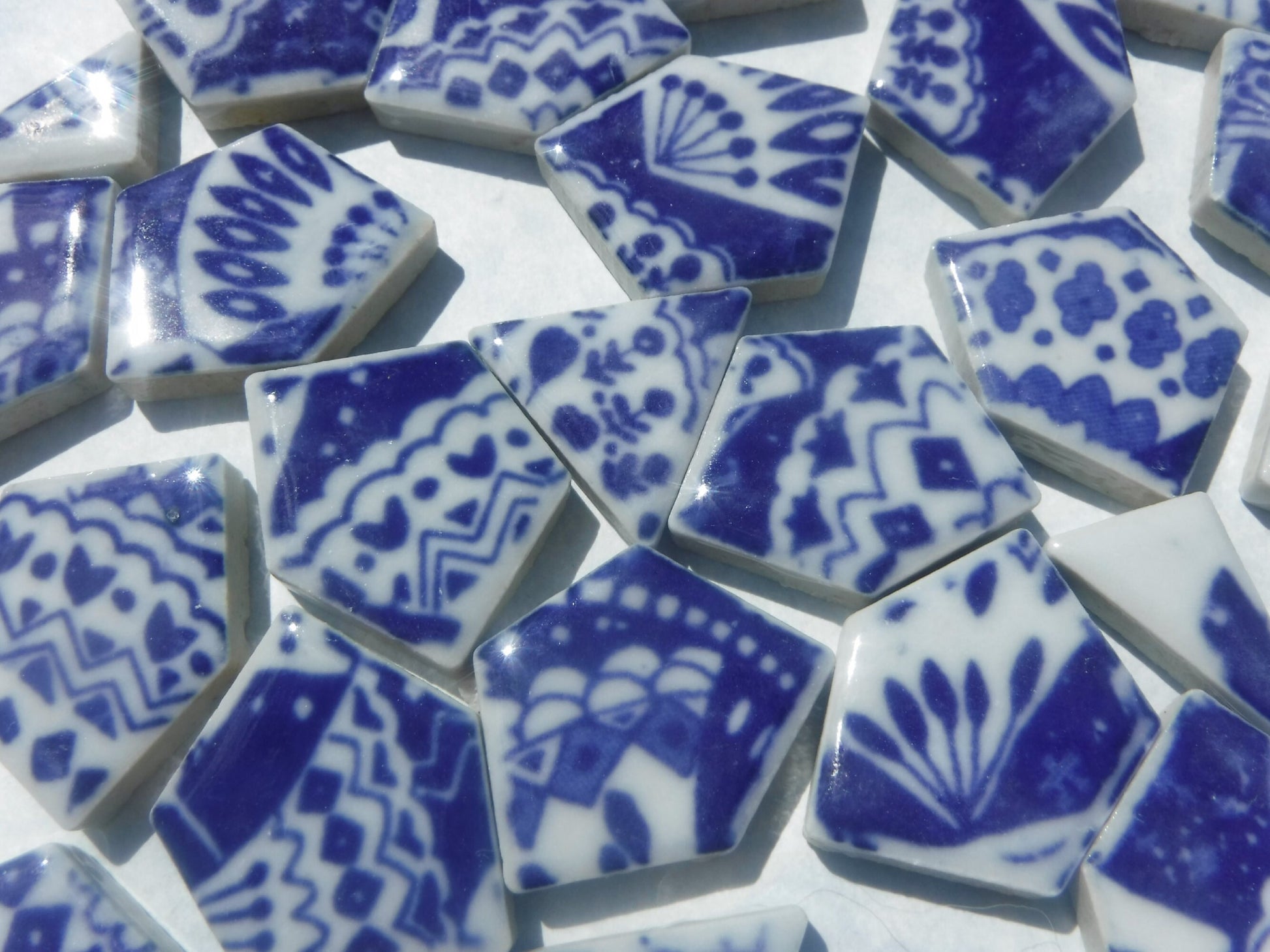 White Decorative Details on Deep Blue Chunky Porcelain Mosaic Tiles - Half Pound
