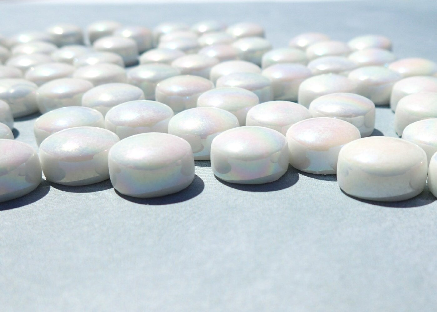 These glass drops are white with an iridized finish. They are 12mm (1/2") in diameter and are 8mm (1/3") thick. Unlike traditional glass gems, these are uniform circles with a domed top and straight sides.