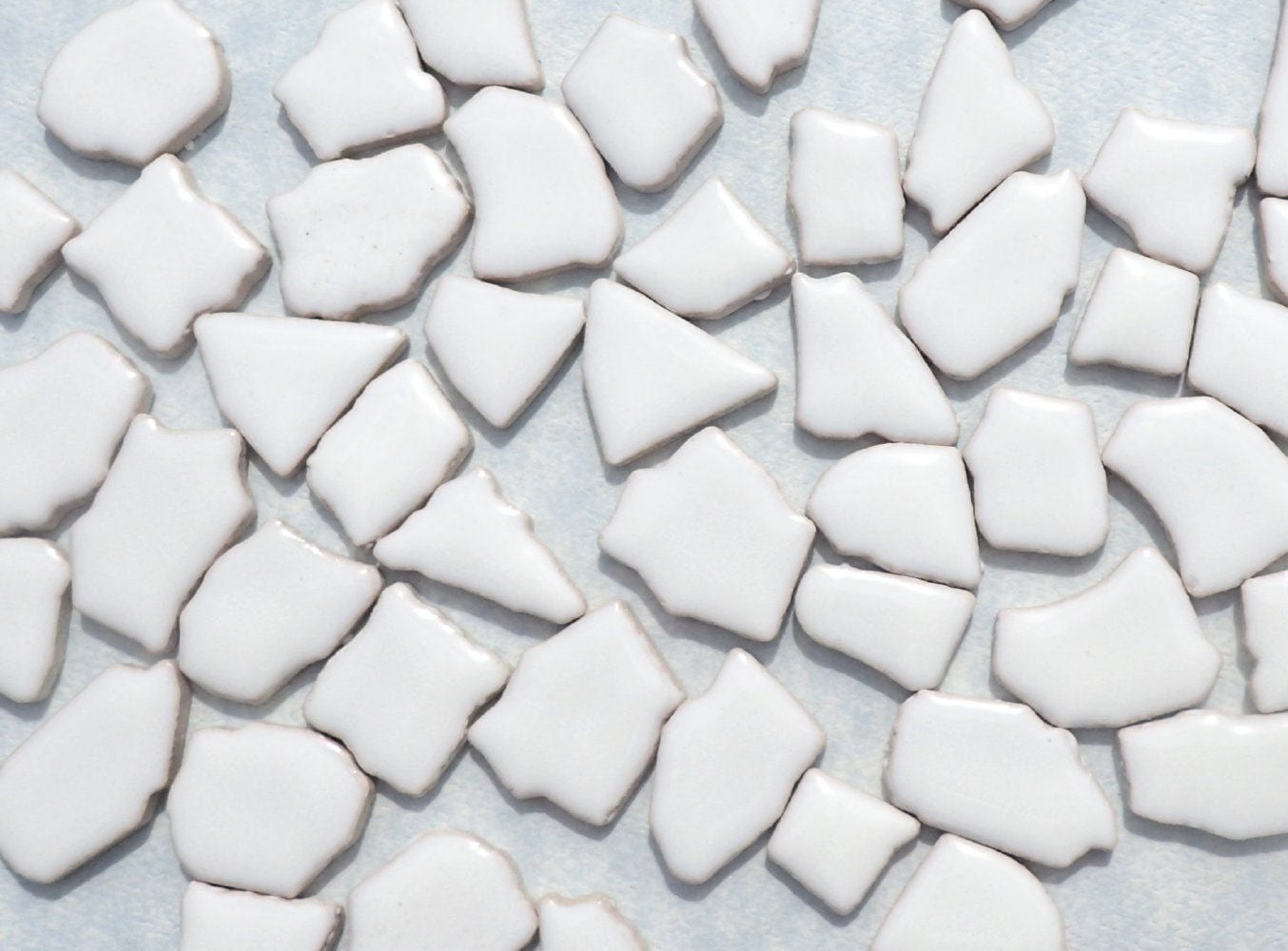 This an assortment of randomly shaped white mosaic tiles. They are fun with unusual curves and edges. Get that great shape with no nipping! Something for every project! This is a half pound of ceramic tiles. Since the sizes of the pieces differ, so will the number of tiles. But a half pound of tiles is approximately 90-100 tiles.
